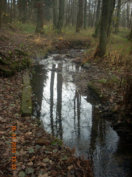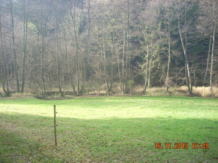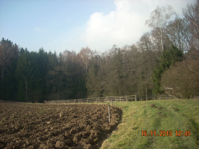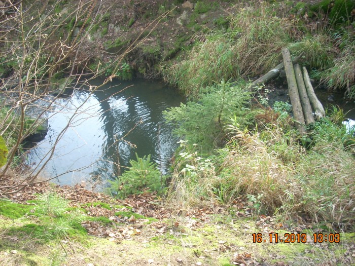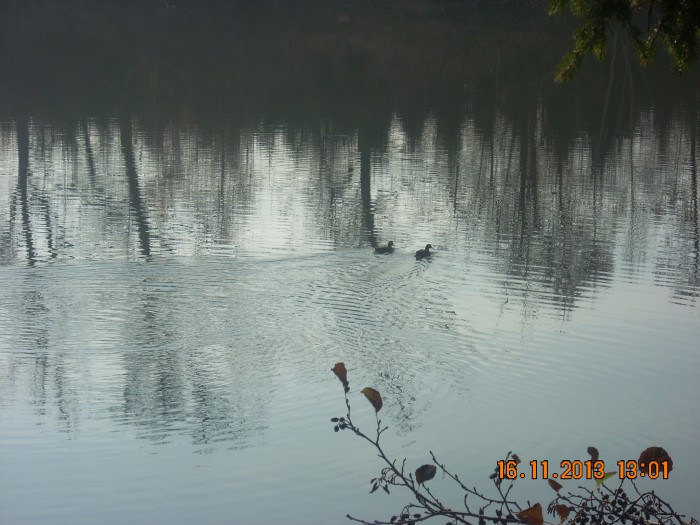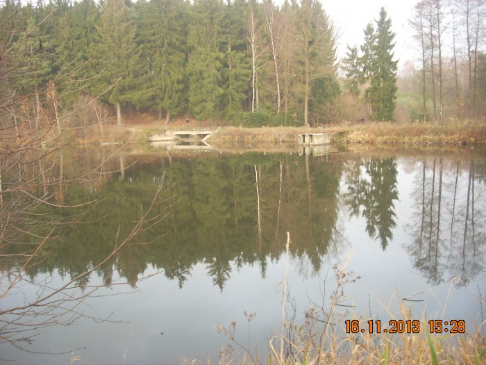 Nemám to daleko, hned za domem cesta k lesu a louce s kravičkami. Zatim jim zima nevadí a klidně si odpočívají. Už u lesa se ozývá strážce lesa - sojka hlásí ostatním obyvatelům, že přichází vetřelec. Padne rána a v zápětí další. Co je to? To jen myslivci pořádají hon. Rány se ozývají z opačné strany, a tak bez obav vcházíme do lesa. Cestička nás vede pod lesem k rybníku. Už dlouho jsem tudy nešla. Mezi stromy se blýská hladina rybníka a...ano, je to ono. Právě tady se to stalo, z jara tu našli igelitovou tašku s novorozencem. Brr, není to hezký pocit. Vzpomínám si, jak jsem v neděli procházela okolo a v pondělí ukazovali tohle místo v televizi. Mrazí mě ještě teď.