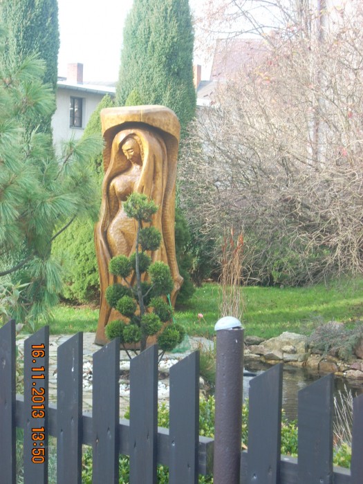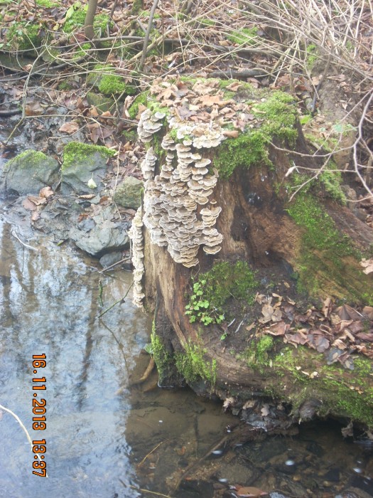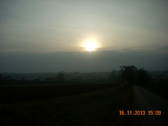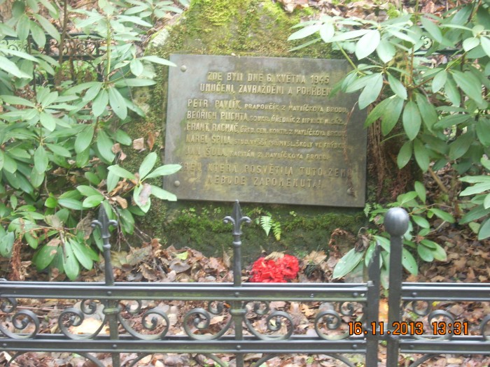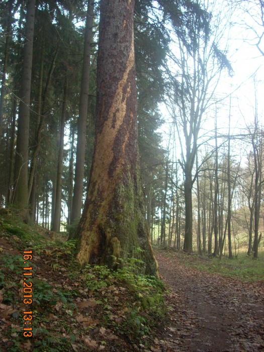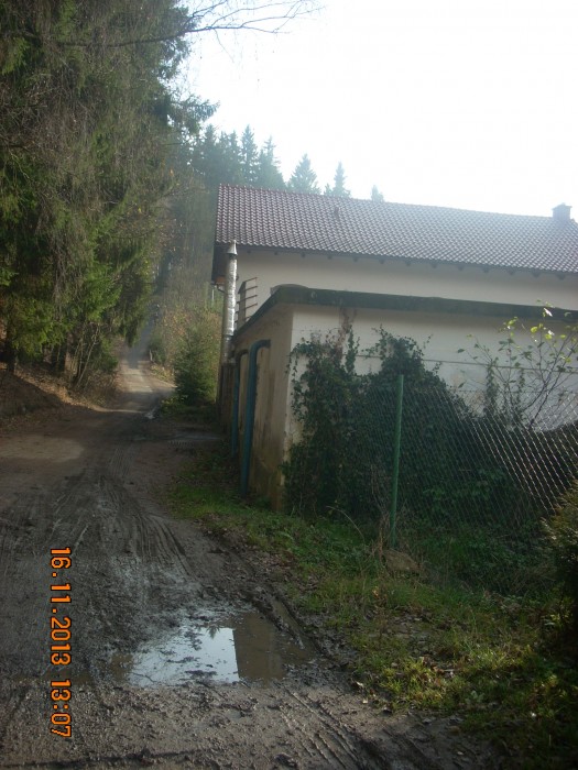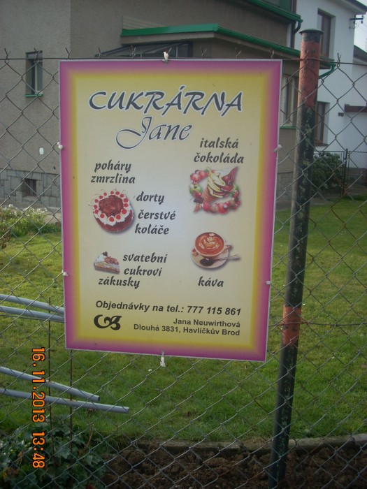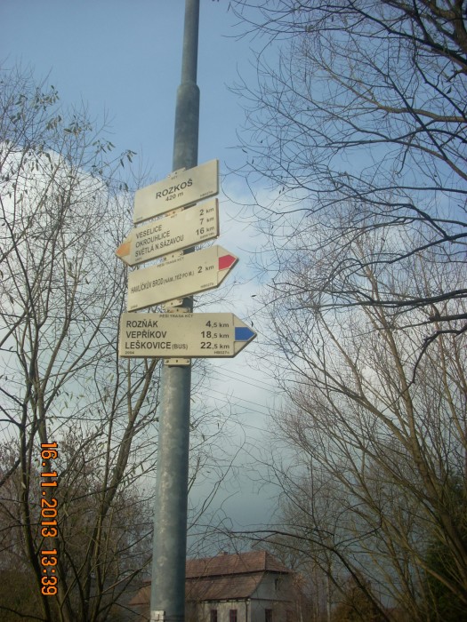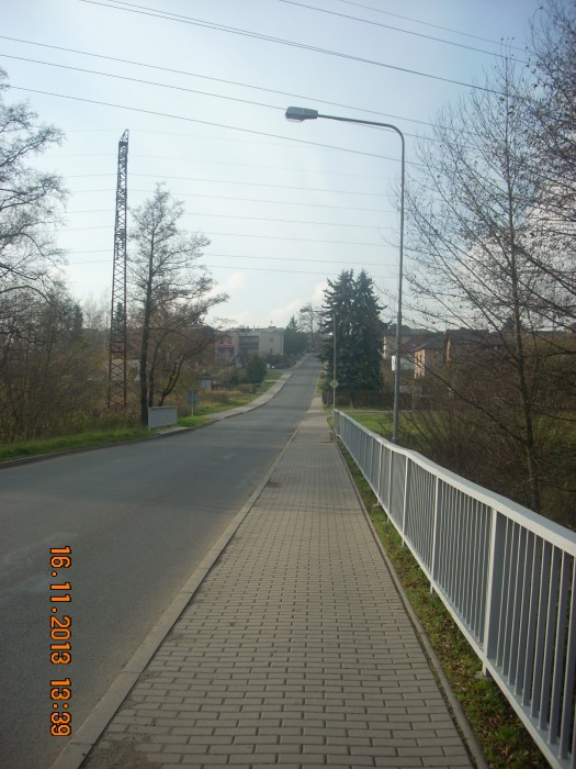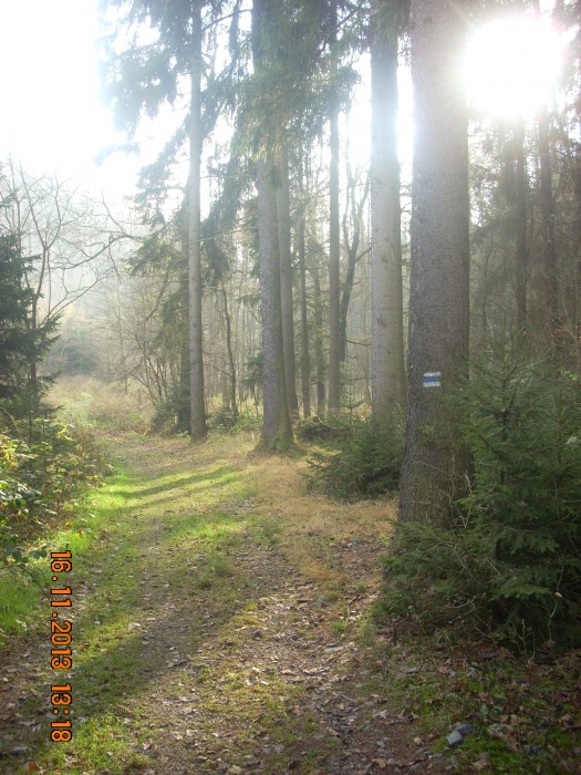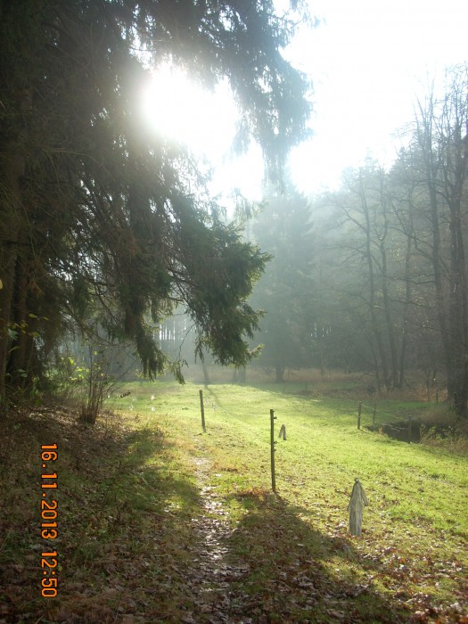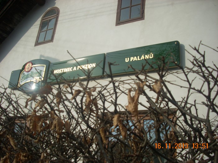 Kolem zazimovaných úlů pokračujeme k bývalé vodárně. Už dávno neslouží jako vodárna pro město, a tak jakýsi mladý pár to odkoupil a přestavěl na krásný dům. Přichátíme na značenou turistickou cestu. Odbočíme po modré. Tady to znám dobře, časté putování po této trase bylo před více než rokem za maminkou do nedaleké nemocnice. Po pravé straně zurčí malý potůček a z druhé strany vysoká stráň zarostlá lesem. Ještě kousek a došli jsme k pomníku padlých ve válce. Sluníčko na nás prokukuje mezi opadanými stromy a stíny připomínají, že se rychle bude stmívat. A to už se blížíme k prvním domům ,,předměstí". Ještě nafotit směrovku, první ulici a jsme v hospůdce U Palánů, kde už čeká kamarádka.
