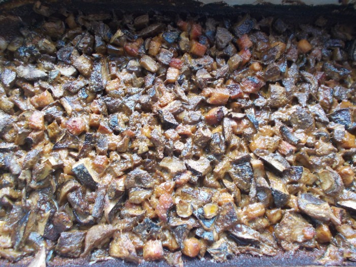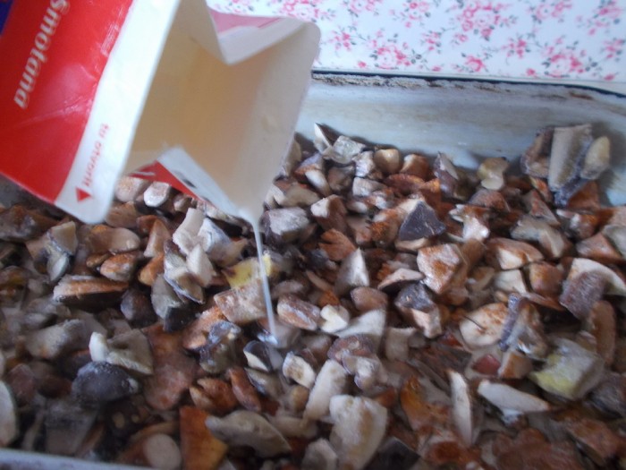 Nakrájíme houby (například růžovky) na větší kousky, stačí na čtvrtky. Na kastrůlku osmažíme nakrájenou anglickou slaninu nebo dobré uzené, přidáme houby, osolíme, okořeníme grilovacím kořením a zalijeme smetanou - nejlépe na šlehání. Pečeme asi 45 min až 1 hod. při 200 stupních.