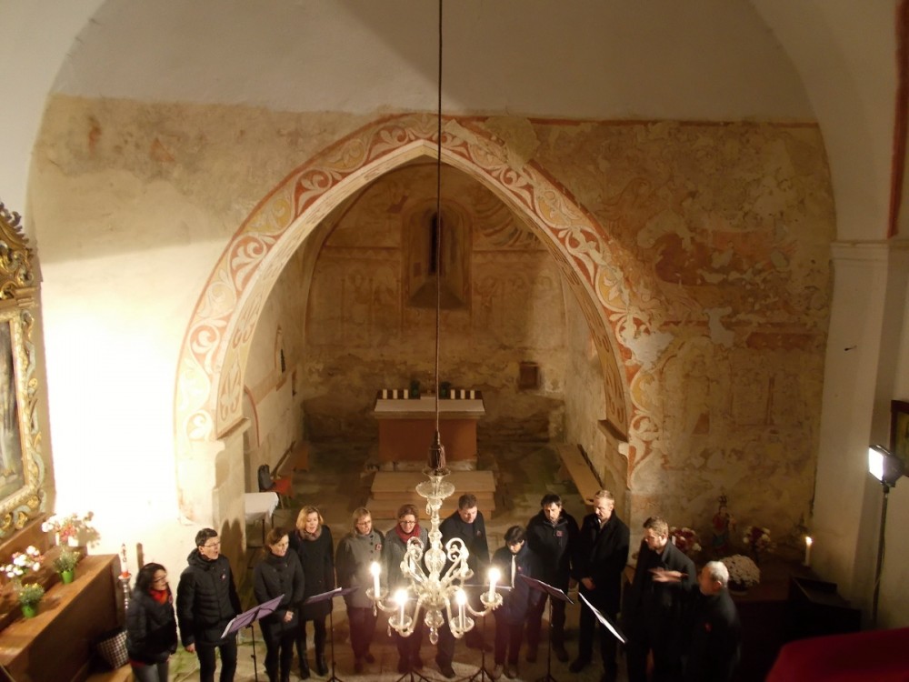 U prvního kostela sv.Jiří v Řečici nás udivuje mnoho aut. Malý kostelík se zaplňuje a před oltářem stojí pěvecký humpolecký sbor TUCET. Pár úvodních slov průvodce a předává slovo souboru. Akustika kostela jen umocnila pěveckou krásu. Ještě něco o kostelu, podrobná prohlídka kněžiště a už se přesouváme do Loukova, kostela sv.Markéty. TUCET zpívá další písně, tentokrát z jiného soudku, a my jen tiše nasloucháme a prohlížíme si původní malby na zdech. Ještě trocha informací o původu a jedeme, už za tmy, do posledního dolnoměského kostela sv.Martina. Právě dnes se tu slaví Martinská zábava. Kostel ožil písněmi, tentokrát i českými a závěrečným aplausem a přídavkem TUCET ukončil akci.