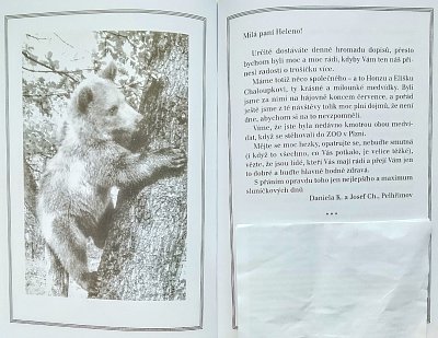 Při psaní těchto řádků jsem si vzpomněla ještě na jednu věc, související s Chaloupkovými medvídky Honzou a Eliškou. Jednoho dne jsme v tisku objevili fotografii herečky Heleny Růžičkové, která se stala kmotrou Elišky při jejím stěhování s bráškou do plzeňské ZOO. Paní Helena se již tehdy léčila s rakovinou, tak nás napadlo jí udělat radost. Napsali jsme dopis (v galerii), přiložili několik fotografií medvídků a s prosbou o předání vše poslali její ošetřující lékařce.