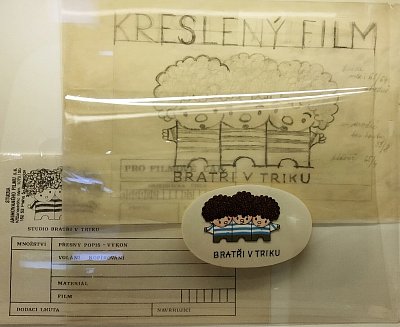 Ve výstavních vitrínách naleznou návštěvníci velké množství artefaktů, od originálních loutek z pohádek (v galerii) přes ukázky filmových pásů či některých krátkých reprodukcí televizního pořadu Večerníček. Vlevo na snímku dnes už téměř nesehnatelná kniha, vpravo návrh oblečení táty Josefa z osvětového večerníčku Povídání o mamince a tatínkovi.