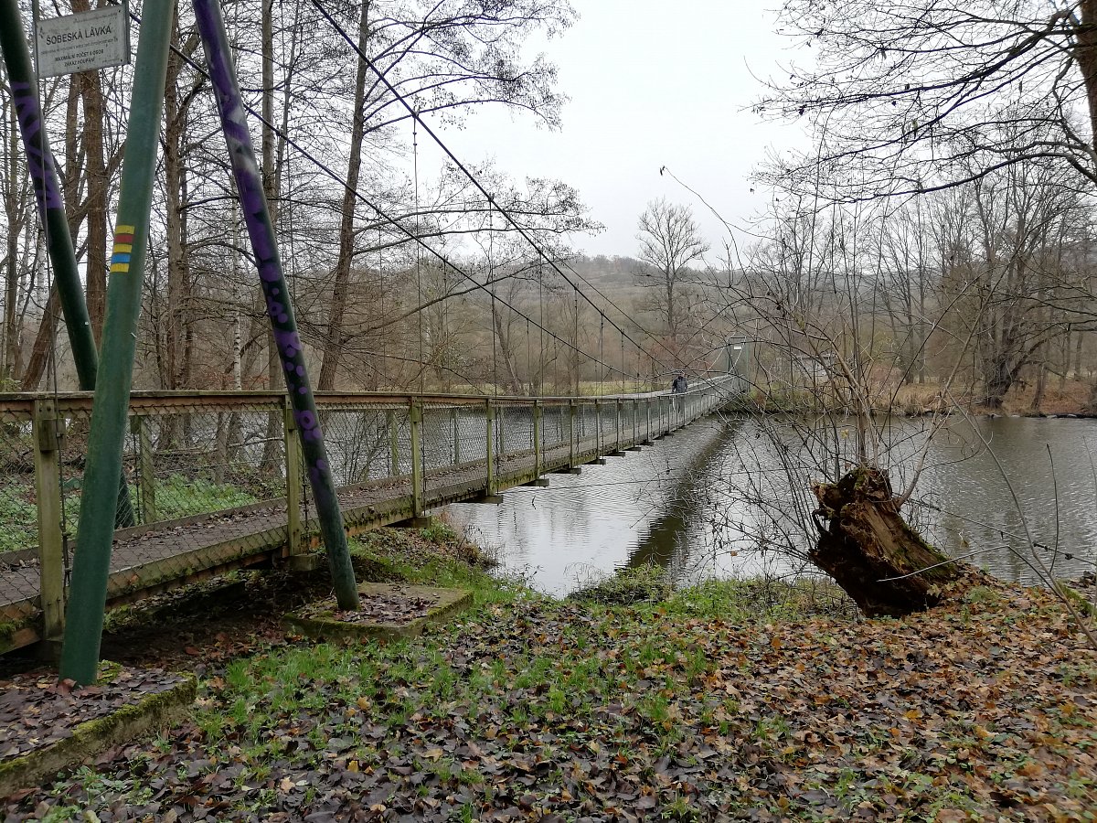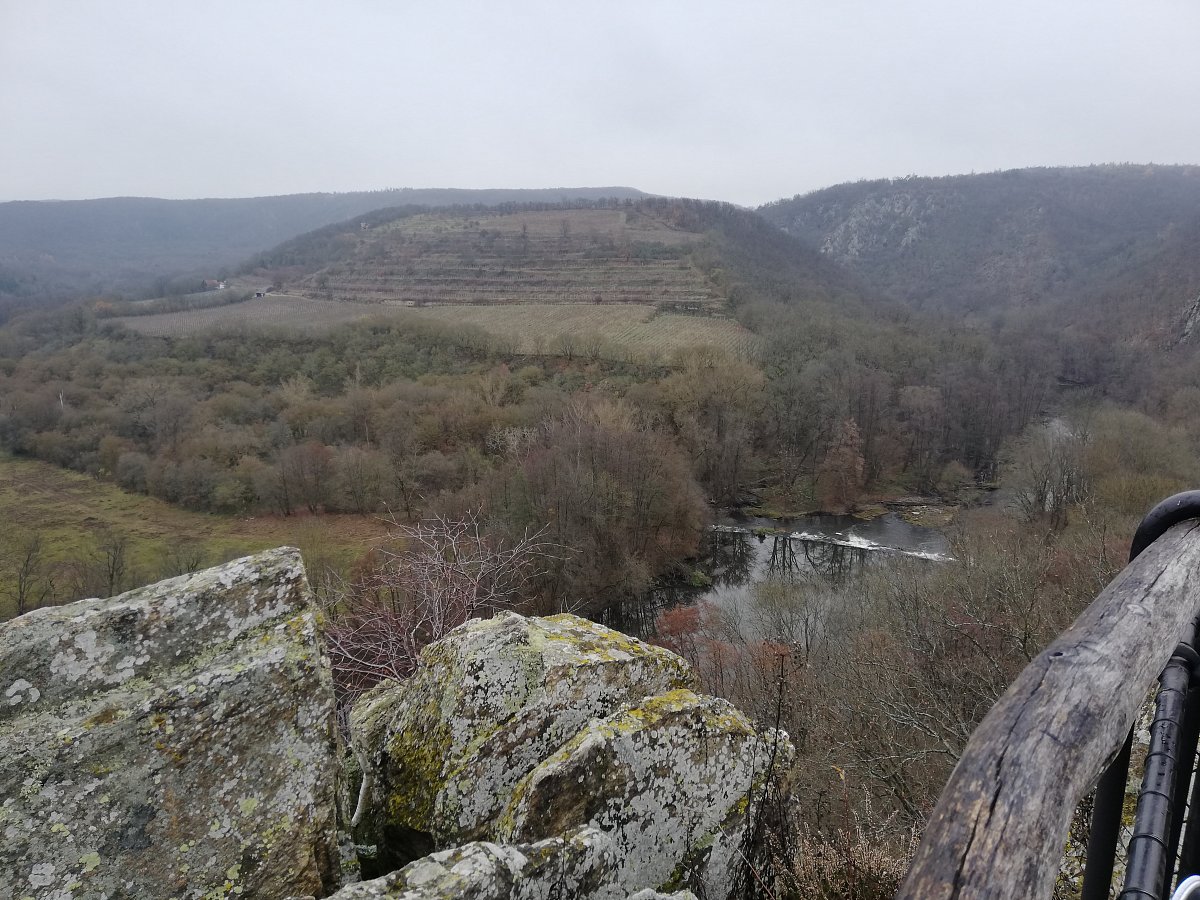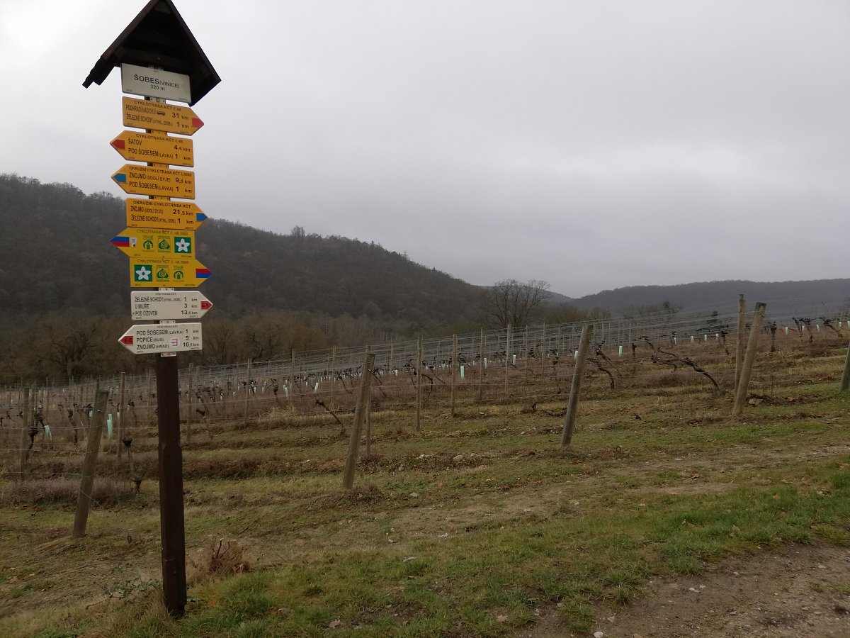Z parkoviště Hnanice na vyhlídku Devět mlýnů, Pod Šobesem, vinice Šobes, vyhlídka Železné schody, U Milíře, Lipinskou cestou do Hnanic a Šatova.