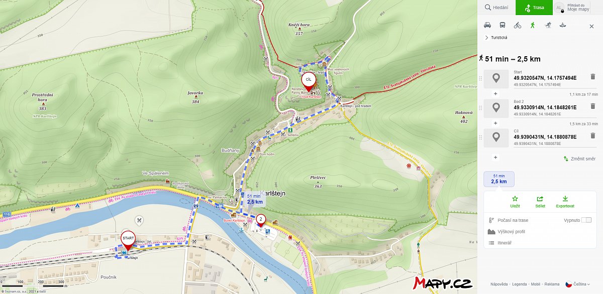Start na nádraží ČD Karlštejn, přes Berounku k Dubňanské skále a na hrad Karlštejn. Stejnou cestou zpět na vlak.