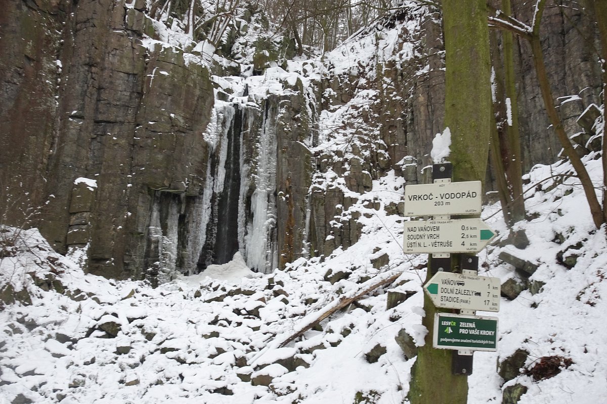 Zajímavá atrakce v blízkosti Ústí nad Labem. Podlešínský potok padá v rokli přes skálu, v zimě zamrzá a tvoří ledovou nádheru.