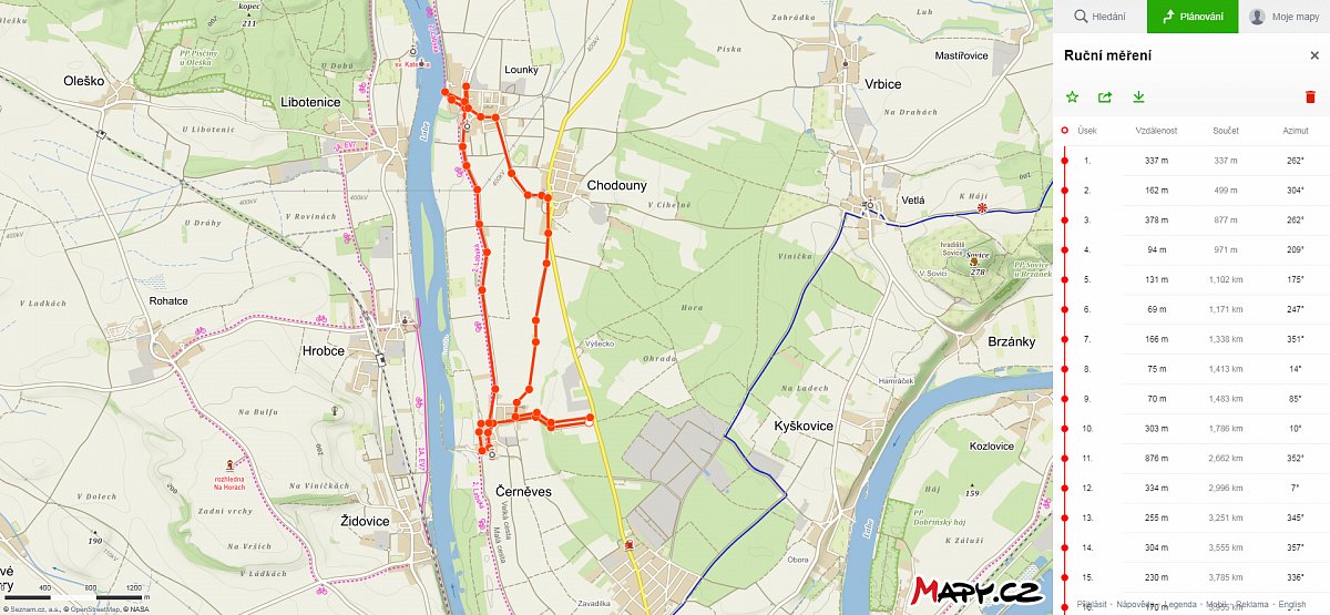 Moje oblíbená vycházková trasa začíná u odbočky na Černěves u silnice Roudnice n. L.-Litoměřice, vede do Černěvsi, Lounek se vzpomínkou na Starce na chmelu,kostelem s hrázděnou věží a pohledem přes Labe na kostel sv. Kateřiny v Libotenicích , dál přes Chodouny po polní cestě zpět do Černěvsi.