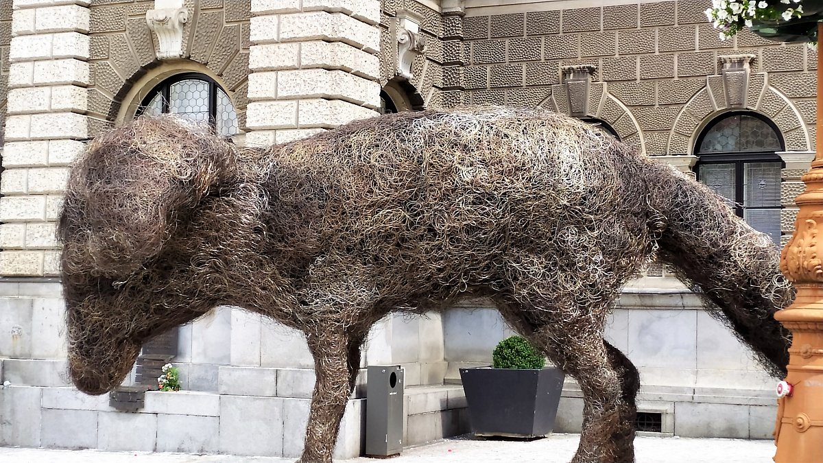 Procházka Libercem. Na fotce krásná liberecká radnice a před ní obluda (zastávka), o které jsem se dočetla na netu: Čtyřtunový drátěný pes Vulpes Gott nazývaný také Dratoslav von Mischling nebo Slávek je novým uměleckým dílem na nároží liberecké radnice. Na radnici visel velký obraz architekta Karla Hubáčka, jenž stojí, mimo jiné, i za slavnou věží na Ještědu ukrývající vysílač a restauraci s báječným výhledem na Liberec a okolí. Zašli jsme si také na kus žvance do občerstvovny "Na kus žvance" :-D a když jsme viděli tu držkovku v červených rendlíkách, neodolali jsme :)