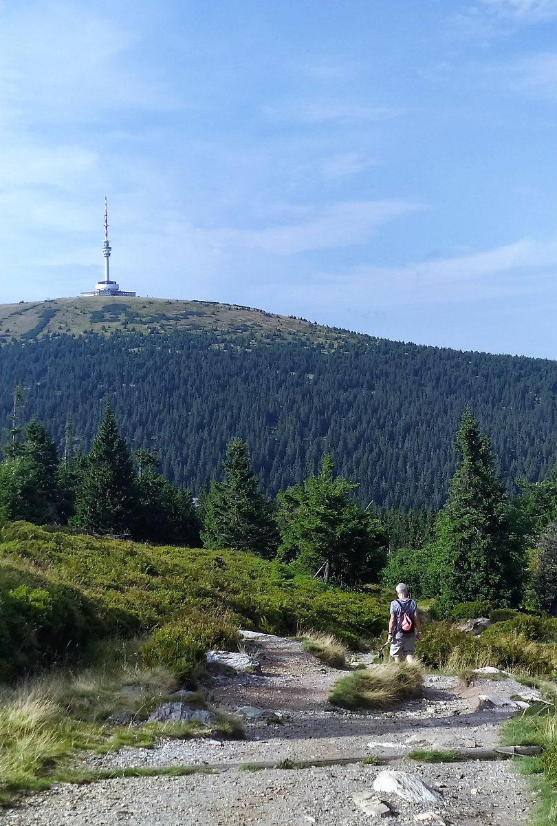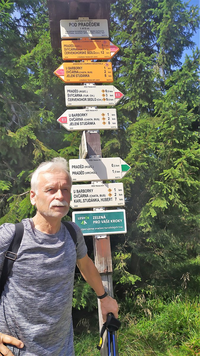 Busem na Ovčárnu a pak pěšky směr Praděd, kde Pod Pradědem jsme odbočili na modrou na Divoký důl - po zelené U kamenné chaty - Pod Zámčiskem - Zámčisko - U Františkovy myslivny - Nad Malým kotlem po červené směr Vysoká Hole a vlevo Petrovy kameny. Scházíme k Ovčárně a dál po známé trase po zelené do Karlovy Studánky.