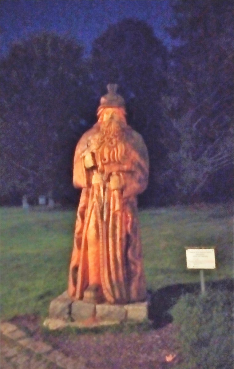 Večerní fontána a dřevěný Praděd v Karlově Studánce.
