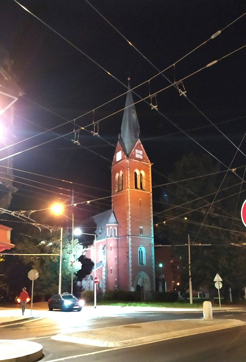 Procházka nočními Teplicemi. Úvodní foto Krušnohorské divadlo, zastávka Červený kostel. Farní kostel Nejsvětějšího (Božského) Srdce Páně, takzvaný Červený kostel (název je odvozen z barvy keramického obkladu), je katolický kostel v Teplicích, v městské části Trnovany. Jde o trojlodní baziliku v novogotickém stylu se zvonicí vysokou 47 metrů. Autorem návrhu je teplický architekt Gustav Jirsch.