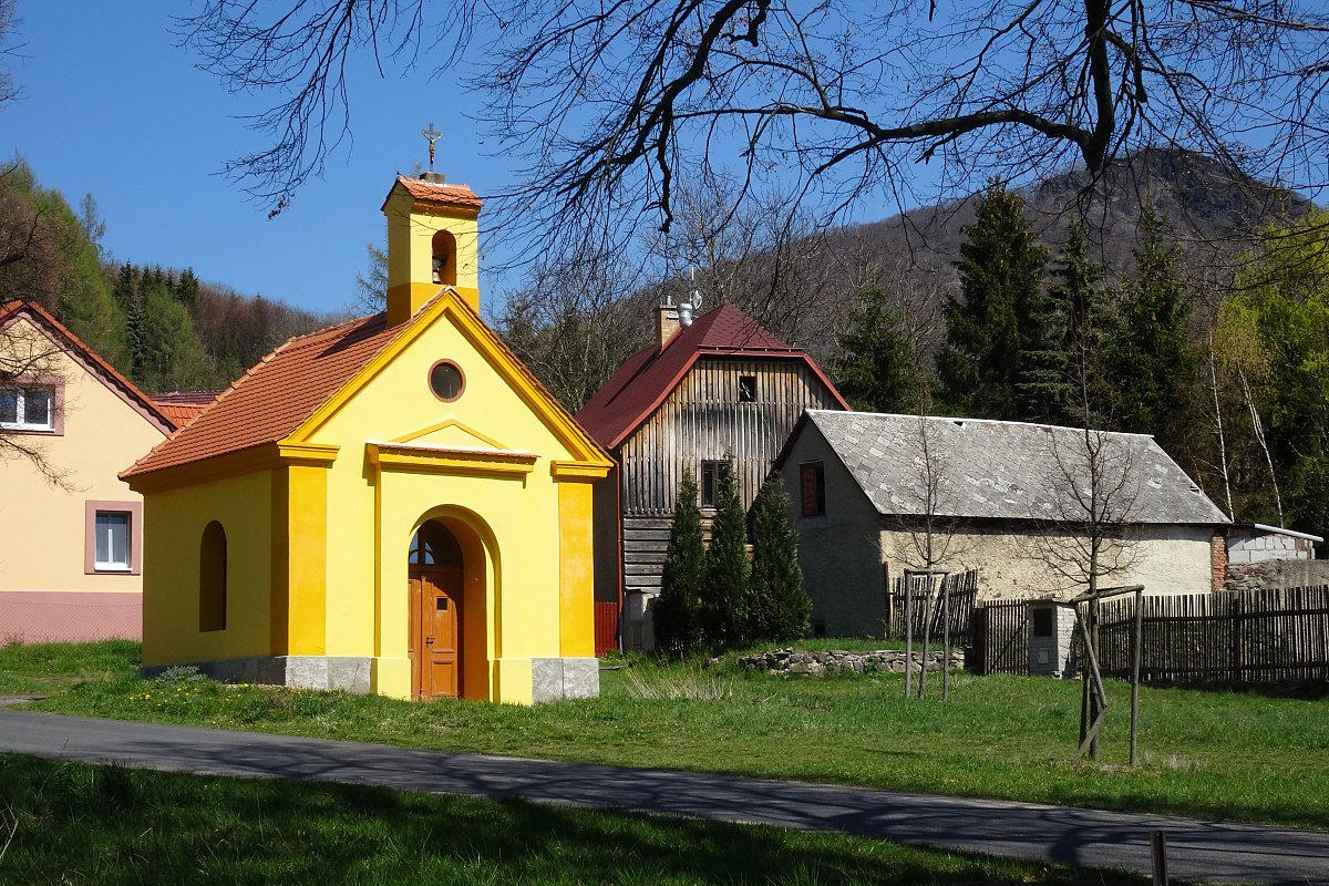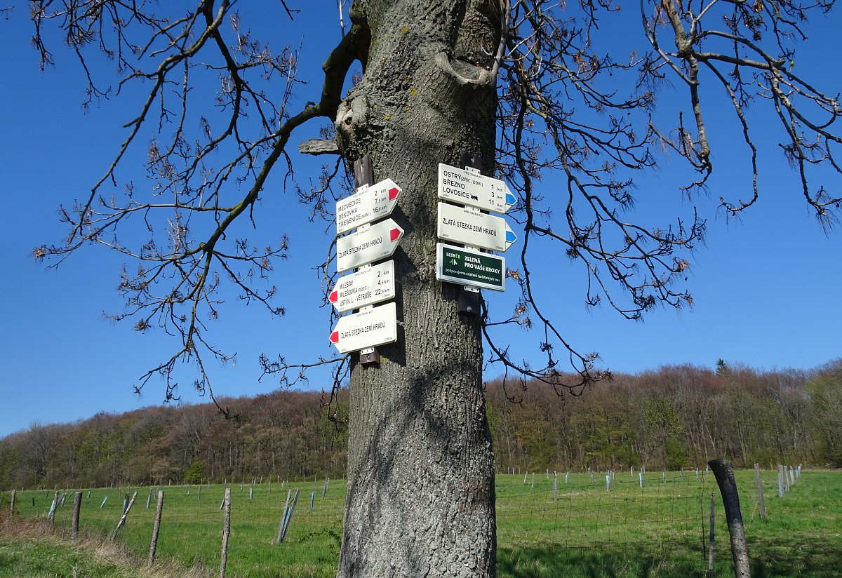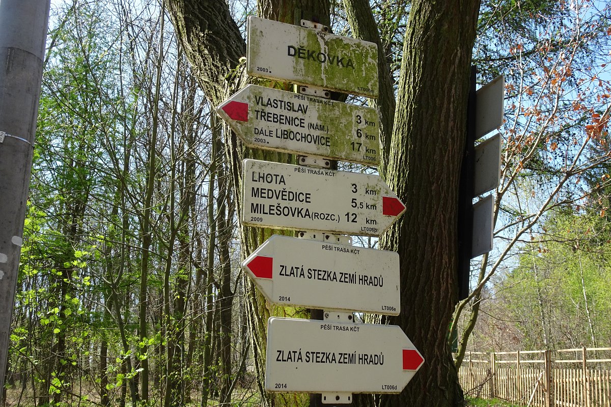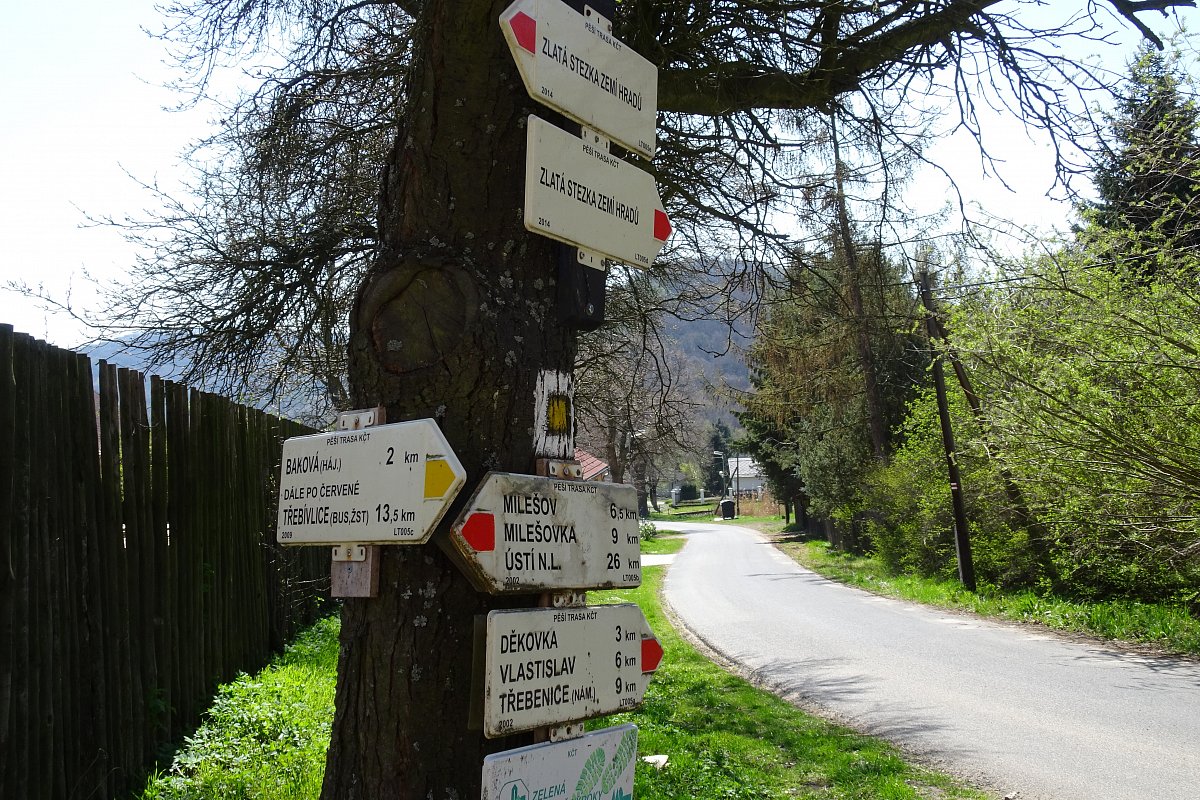 Start v Děkovce, zřícenina hradu Oltářík, dále po červené přes Lhotu na Lipskou horu, dále Medvědice, Kocourov, pod Ostrým do Března na autobus