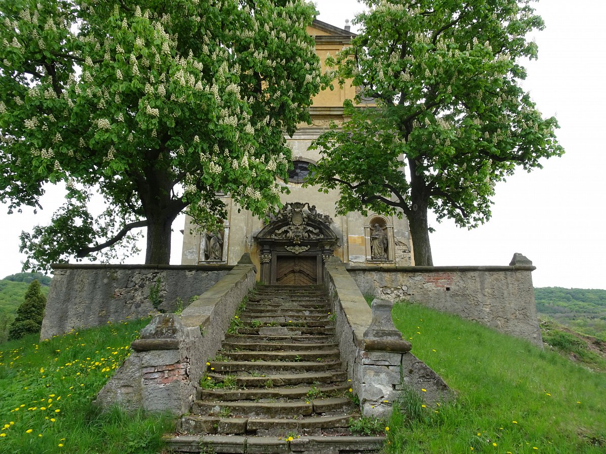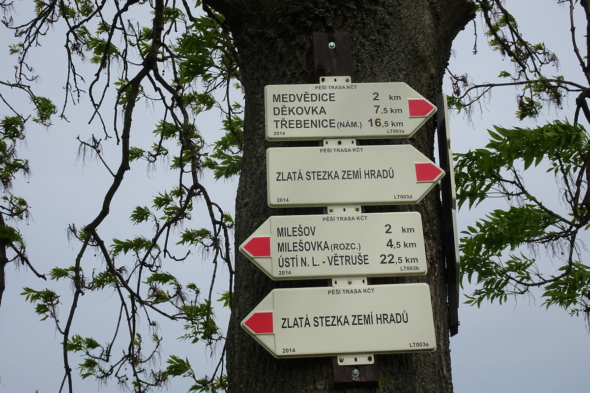 Start Březno, po modré turistické značce na zříceninu Ostrý, odtud po červené do Milešova, odtud po zelené do cíle Velemína