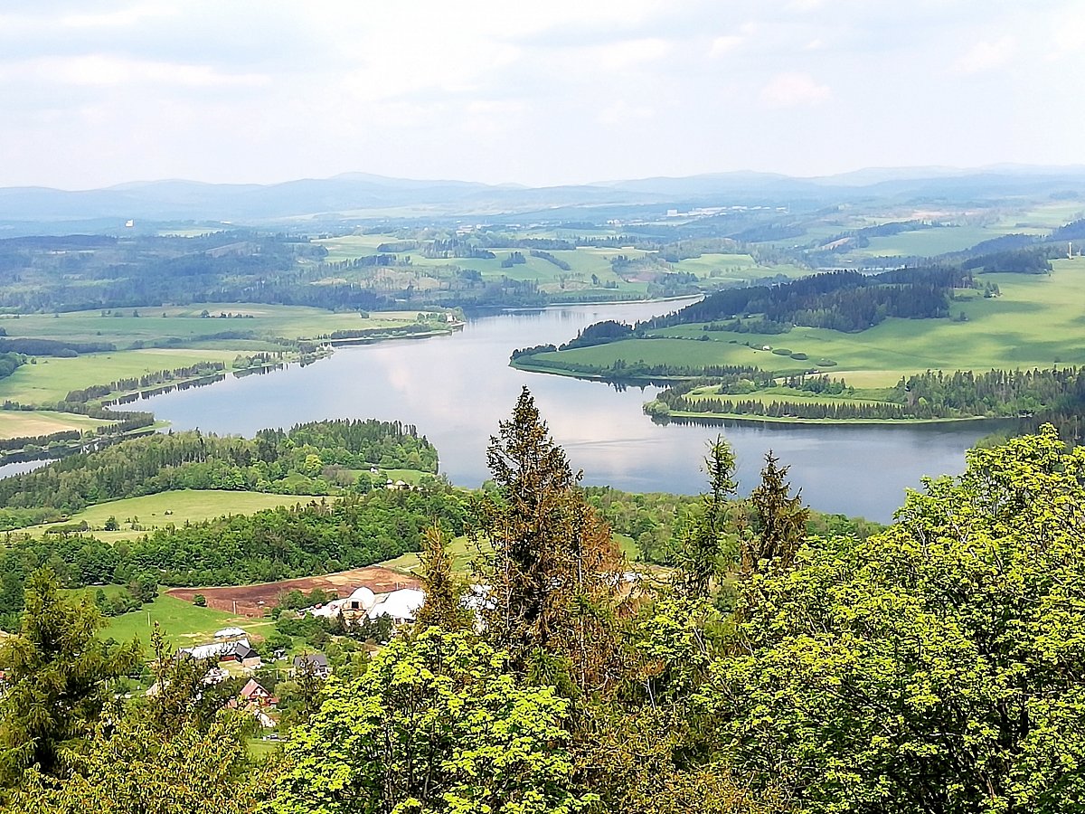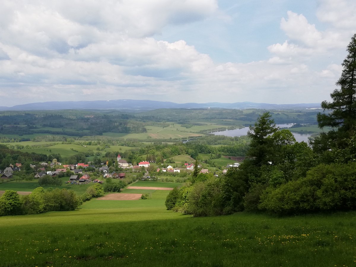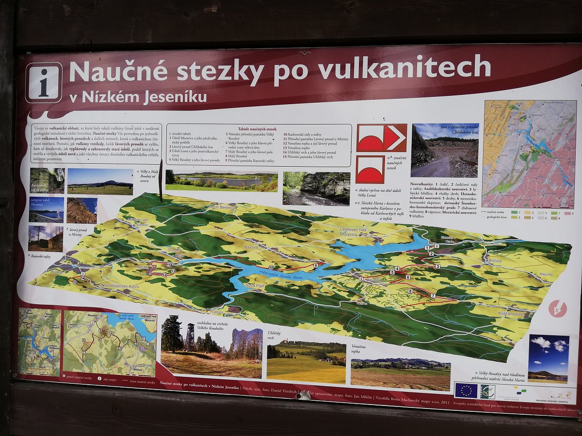 Z malebné vesničky v Nízkém Jeseníku Roudno jsme šli po naučné stezce k rozhledně na Velký Roudný, odkud byl výhled na přehradu. Krajina je sopečného původu a proto i stezky se jmenují Po vulkanitech. Zašli jsme si i k přívozu a na hráz Slezské Harty.