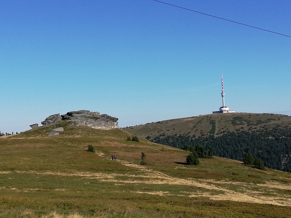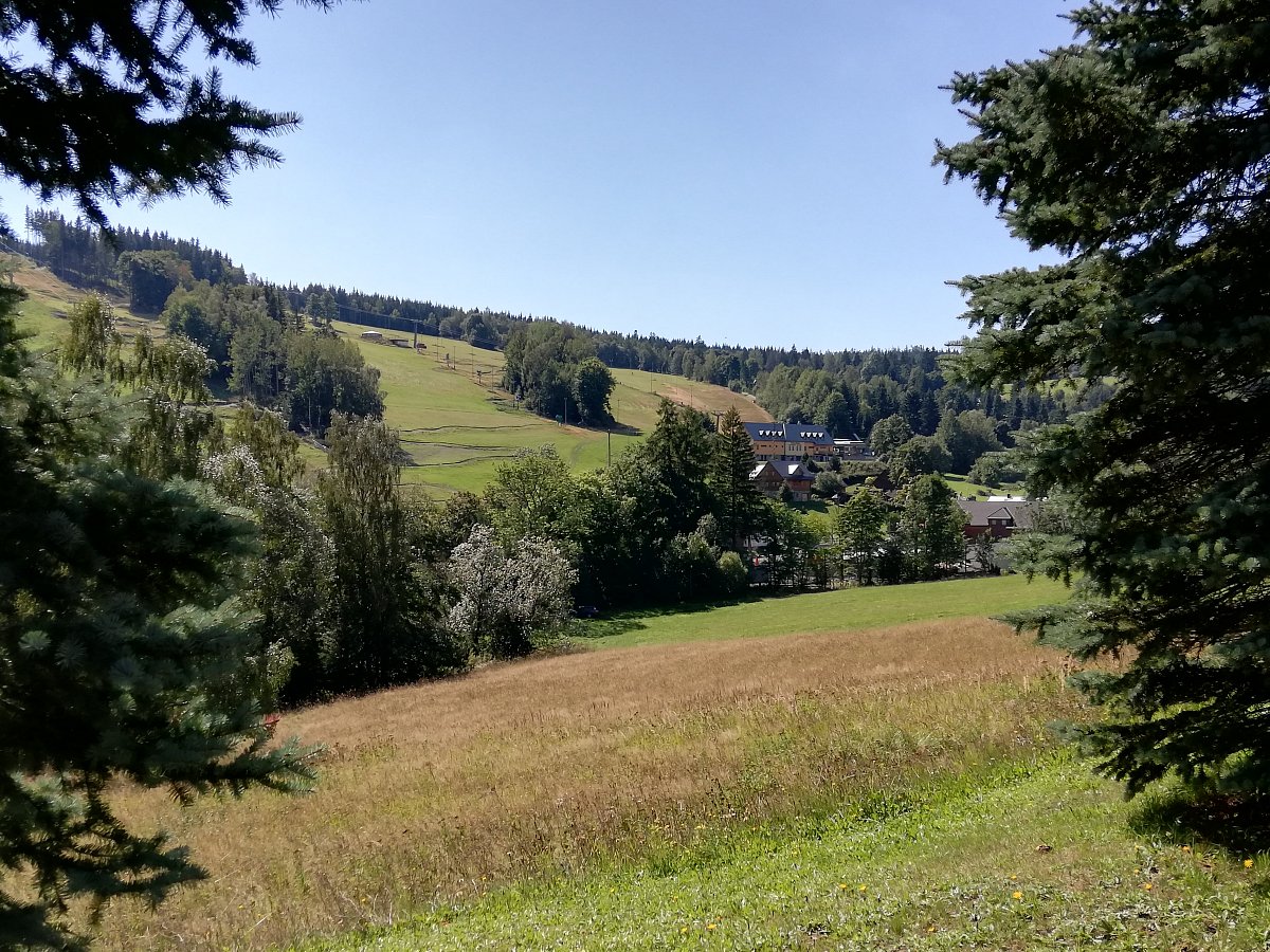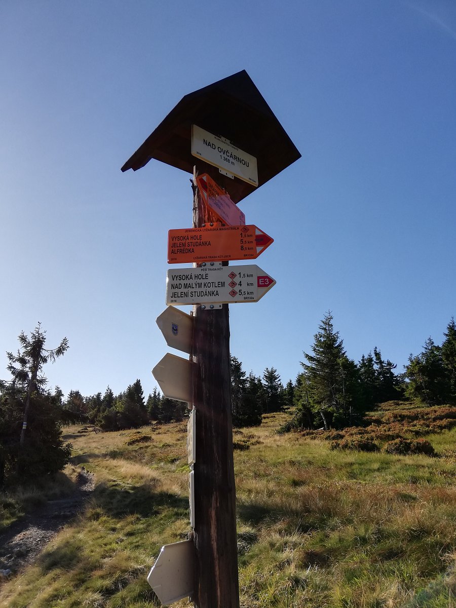 Z Ovčárny po červené kolem Petrových kamenů, Vysoká hole, Jelení studánka, Alfrédka, po zelené na Mravencovku, dále do Karlova a Malé Morávky