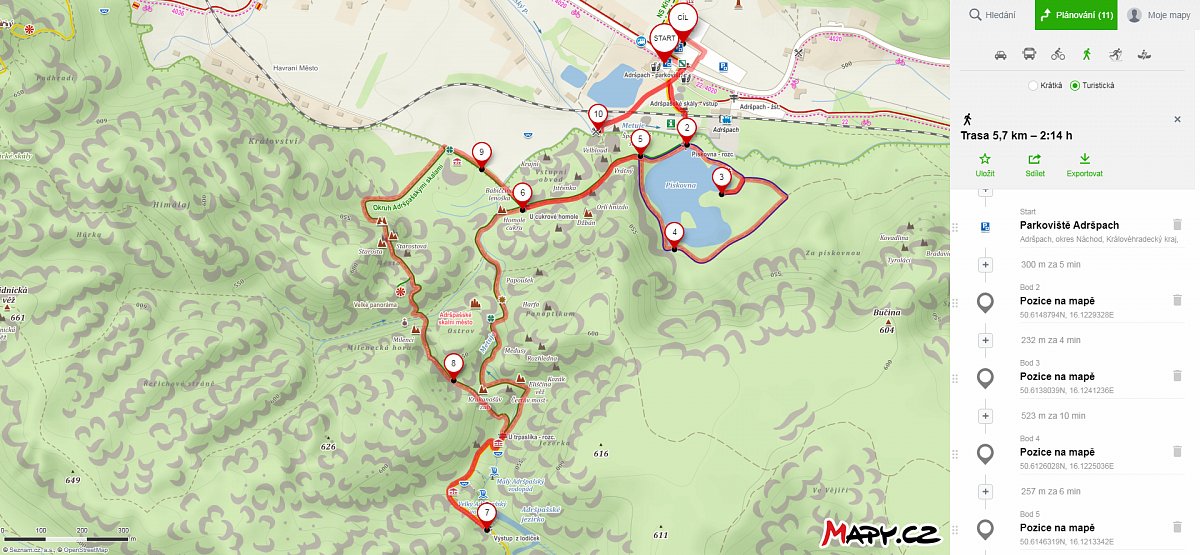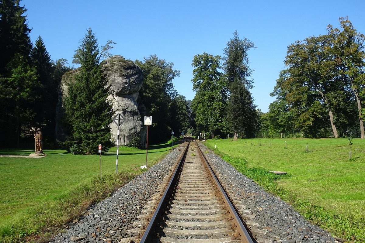 Okruh Adršpaškými skalami začíná na parkovišti. Přejdou se koleje k pokladně a zde začíná značený okruh Adršpašskými skalami kolem pískovny mezi skalami k hornímu jezírku s pramicemi a zpět na start.