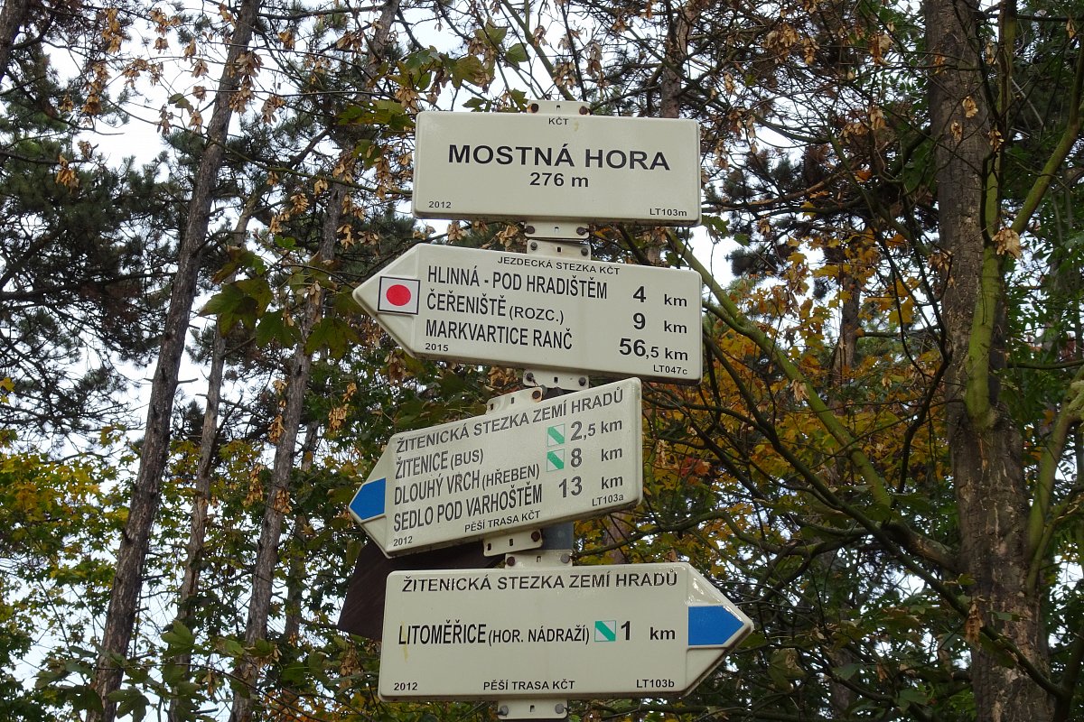 Vycházka z Litoměřic, aut. nádraží kolem nemocnice do Žitenic. Zde napojení na modrou značku a kolem vrchu Kočka na Mostnou horu s vyhlídkou dolů do Litoměřic na horní vlakové nádraží.