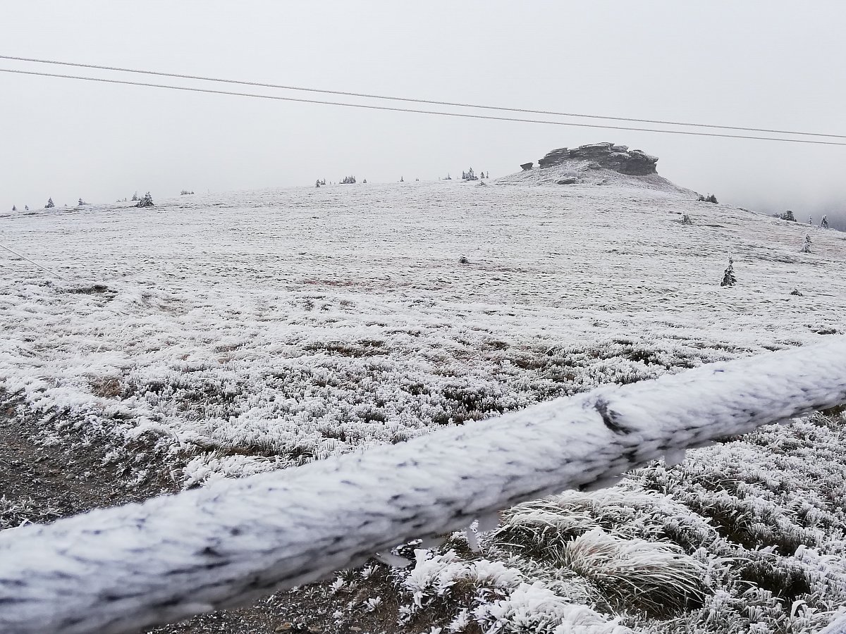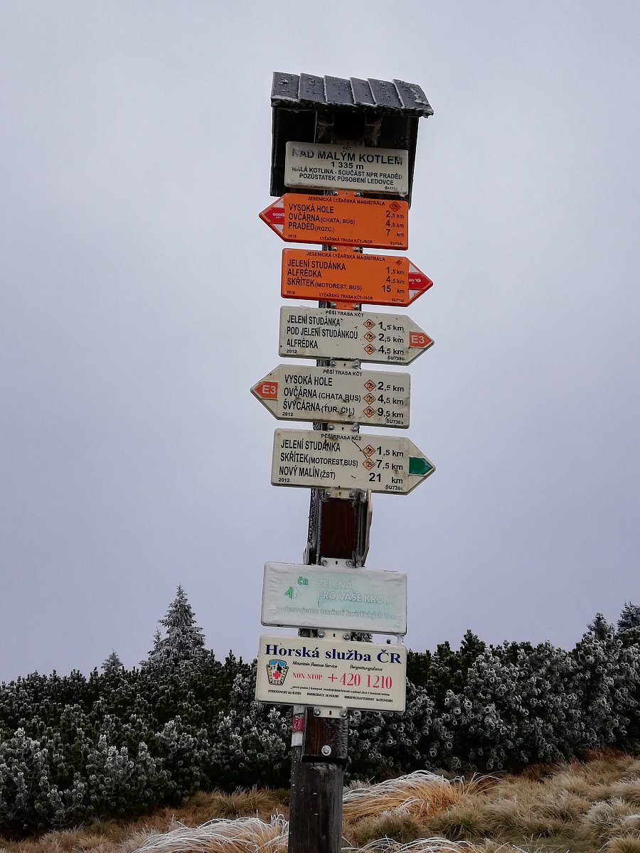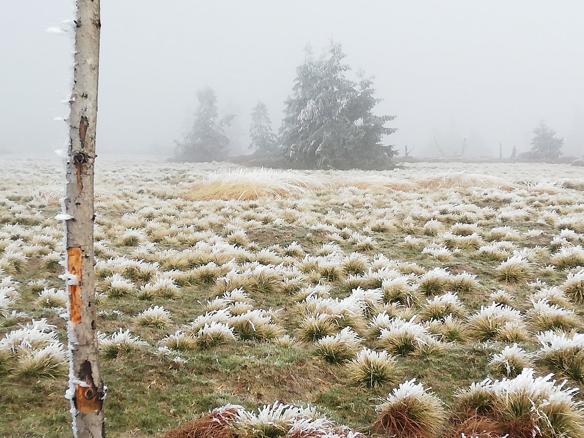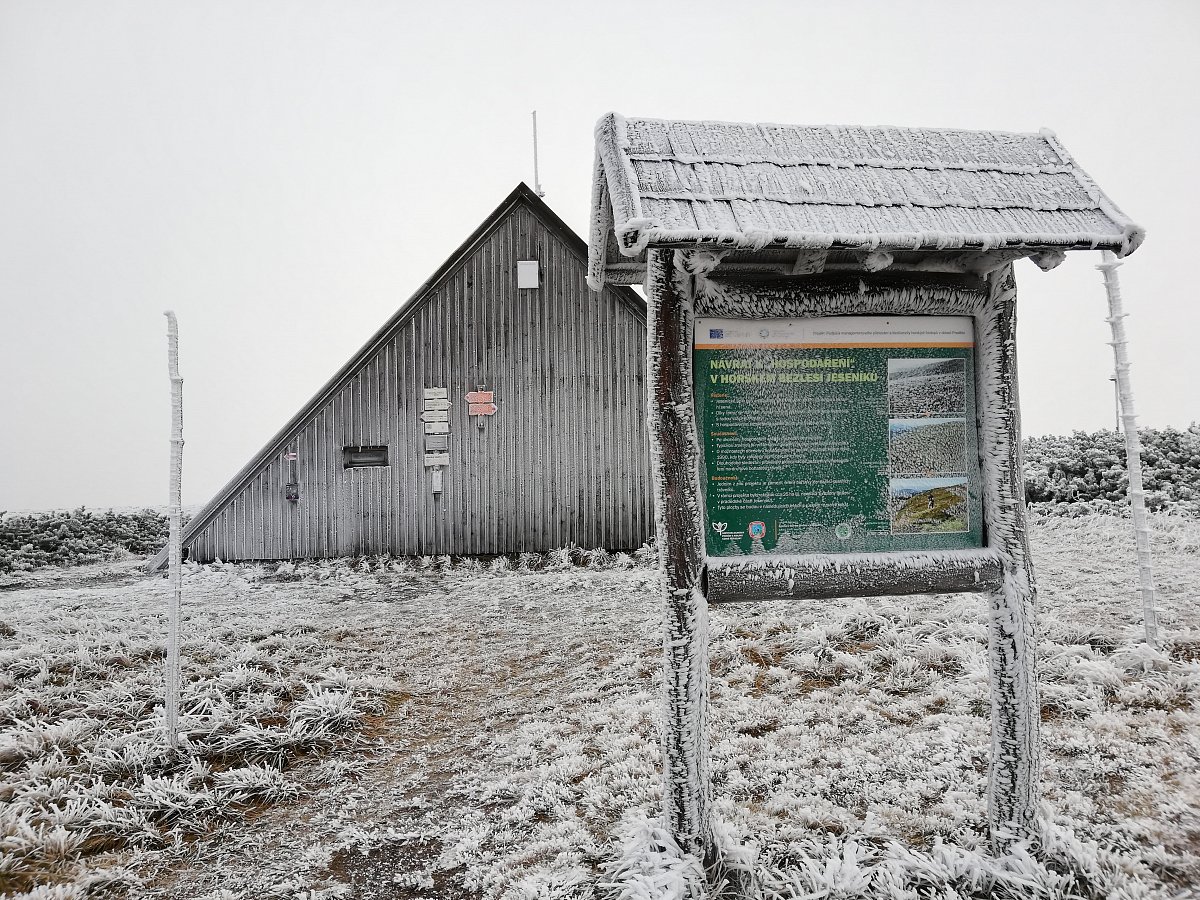 Mrazivým ránem z Ovčárny kolem Petrových kamenů na Vysokou holi. Dále Nad Malý kotel, směr Františkova myslivna, Dolní nádrž Dlouhé Stráně a Kouty nad Desnou. Na hřebeni zima a dole ještě slunečný podzim.