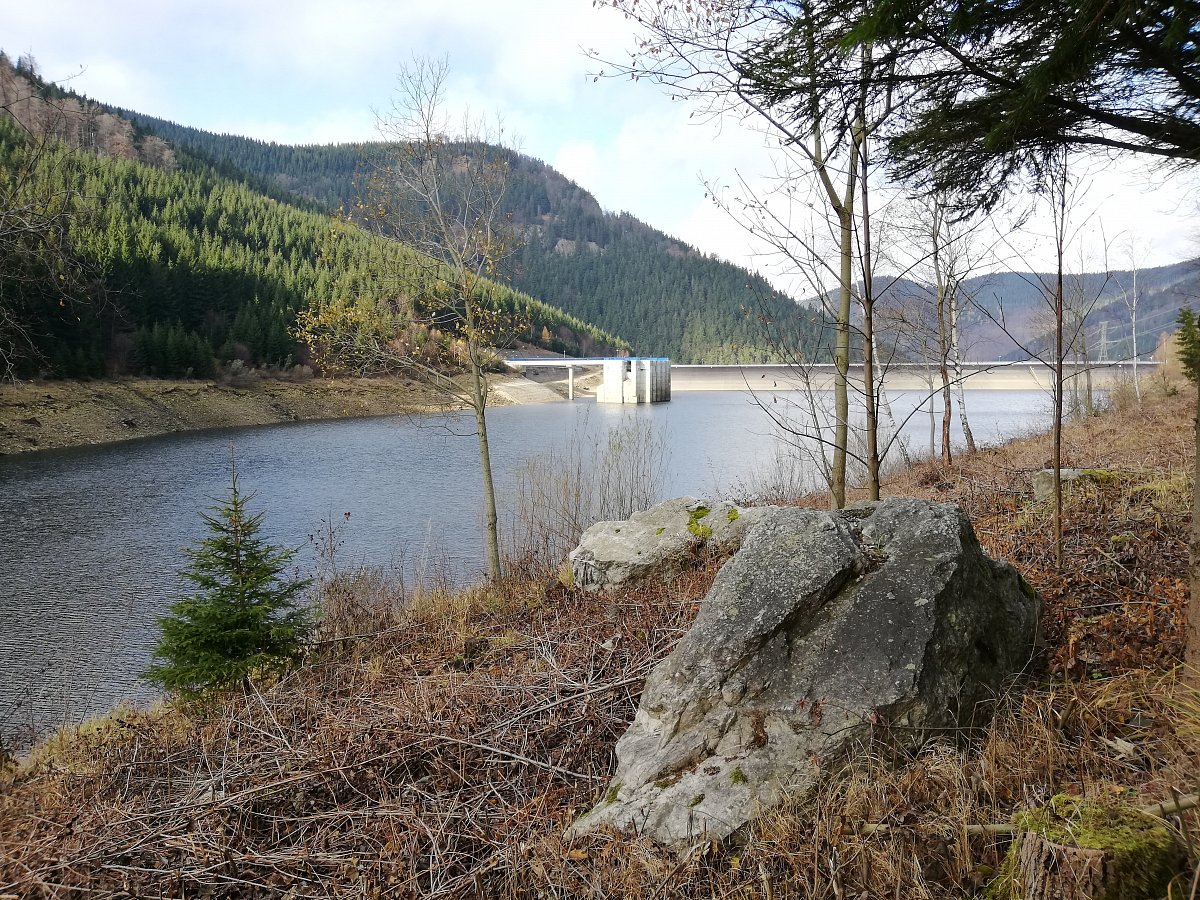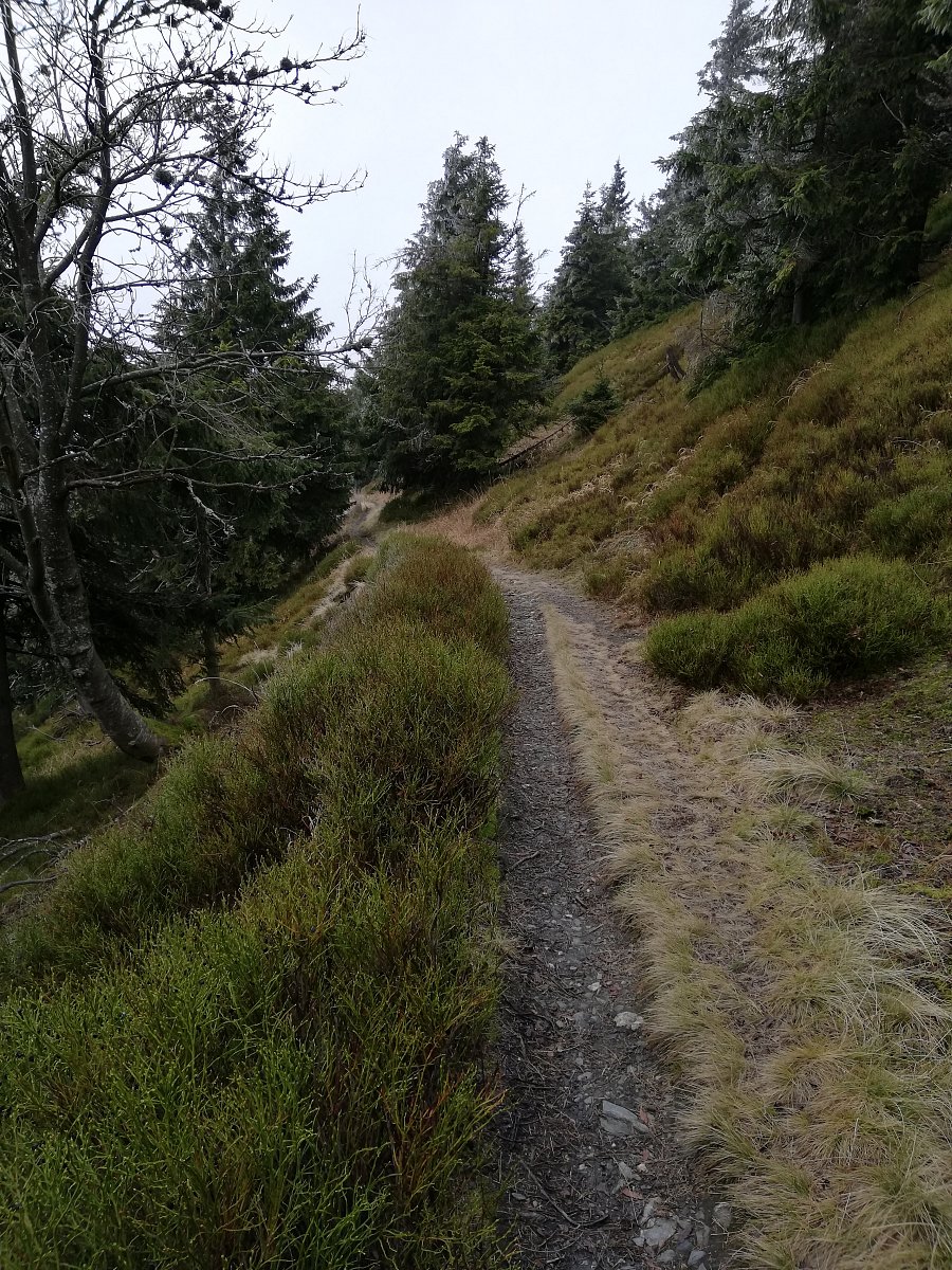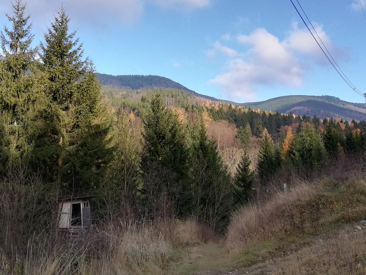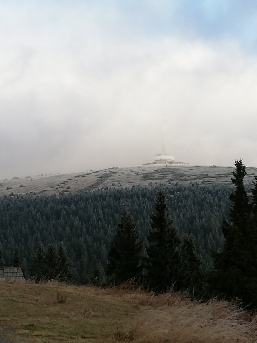 Mrazivým ránem z Ovčárny kolem Petrových kamenů na Vysokou holi. Dále Nad Malý kotel, směr Františkova myslivna, Dolní nádrž Dlouhé Stráně a Kouty nad Desnou. Na hřebeni zima a dole ještě slunečný podzim.