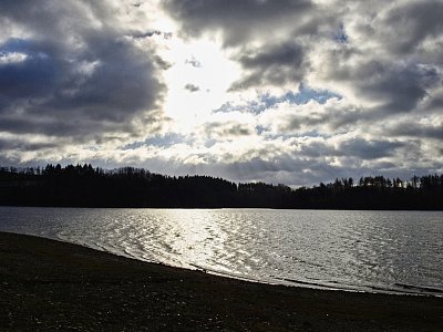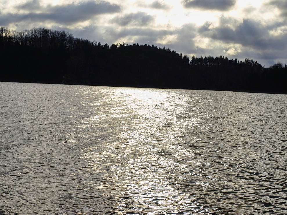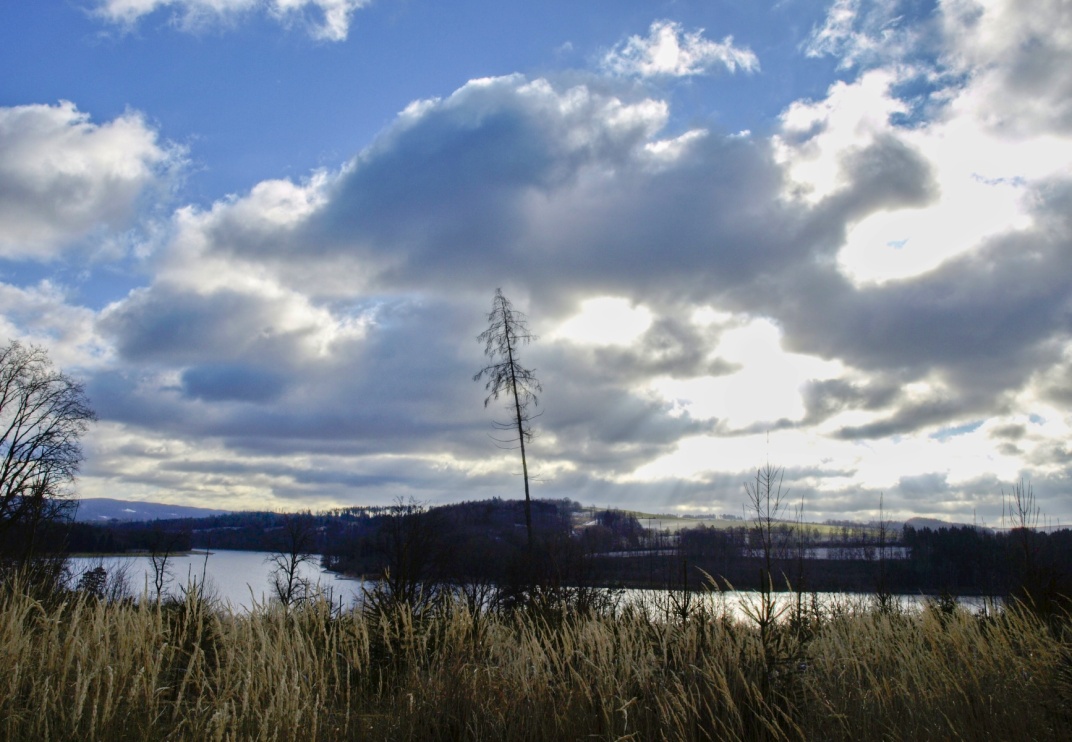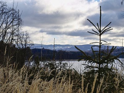 Cestou lesem k nádrži jsem se kochala přírodními úkazy, například osaměle rostoucí borovicí, ohnutou, ale nezlomenou (v galerii). Pomalu jsme se blížili k obrovské vodní ploše (přes 1600 hektarů). Celkový objem je 309 miliónů kubíků vody. Úpravna vody podává výkon sedm tisíc litrů za sekundu. Velkou zajímavostí je, že zde žije jediná dravá kaprovitá ryba v Česku, bolen dravý.