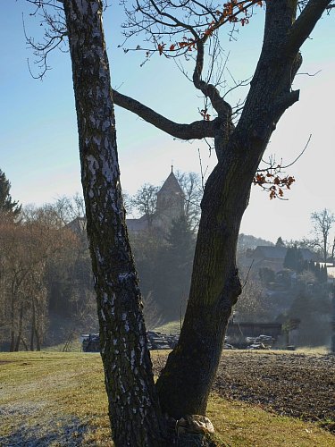 Pohled na hlavní hněvkovickou dominantu v dopoledním oparu