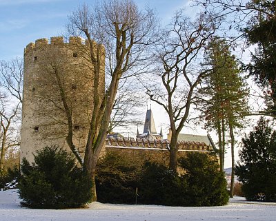 Nejstarším a rovněž chráněným památným stromem je Kolowratský dub, zasazený údajně ve 14. století, nacházející se před středověkou Kolowratskou věží v těsné blízkosti zámku. Postavena byla někdy kolem roku 1334 a sloužila jako hláska hradní stráže a sklad zbraní. Za Schebků byla v sousedství konírna a přízemí věže sloužilo jako kovárna. Nyní zde naleznete expozici středověkých zbraní. Děti se v každém patře interaktivní formou seznamují s historií, dobovými nástroji a zbraněmi připomínající obranu hradu ve středověku. Z vrcholu dvacetimetrové věže se návštěvníkům naskytne krásný výhled na celý zámecký areál.