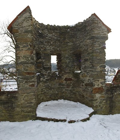 Ze zámeckých hradeb je krásný pohled na město, řeku Sázavu i železniční trať (oblouk vlevo). Pozůstatky původního opevnění dokládají, že byl zámek vybudován na základech středověkého hradu. Pod hradbami vede ,Stezka baronky Emmy', odkud je nádherný výhled na Sázavu i široké okolí. Vzhledem k množství čerstvě napadaného sněhu jsem se rozhodla tuto část procházky raději odložit :-)