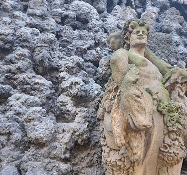 Zde nalezneme různé příšerky, groteskní podoby obličejů, které jsou zde zobrazeny a vykukují z různých zákoutí či z tajných chodeb, které jsou pouze naznačeny. Ve spodní části vylézají ze skrýší a z průchodů žáby či hadi. Umělá krápníková jeskyně, ptačí voliéry a vysoké krápníkové stěny jakoby připomínaly dobu císaře, kde ještě doznívá magická Praha Rudolfa II.