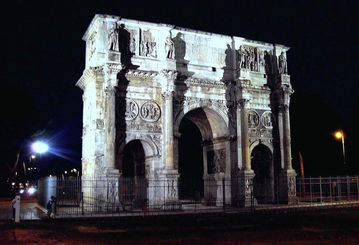 Řím. Večerní pohled na Konstantinův oblouk u Kolossea.
