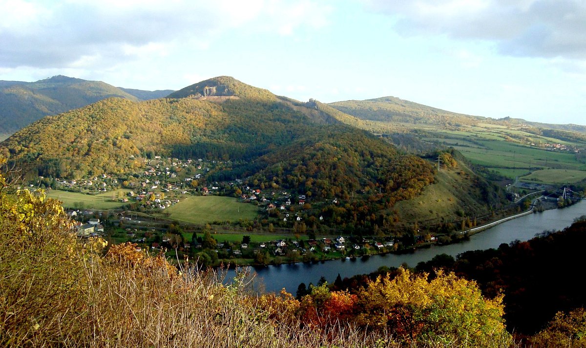 Údolí Labe z vyhlídky Dubičky. Za řekou kopec Deblík