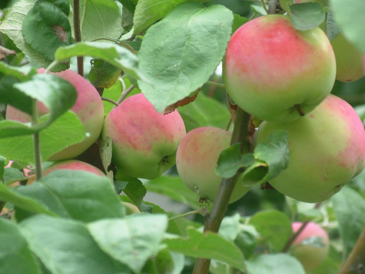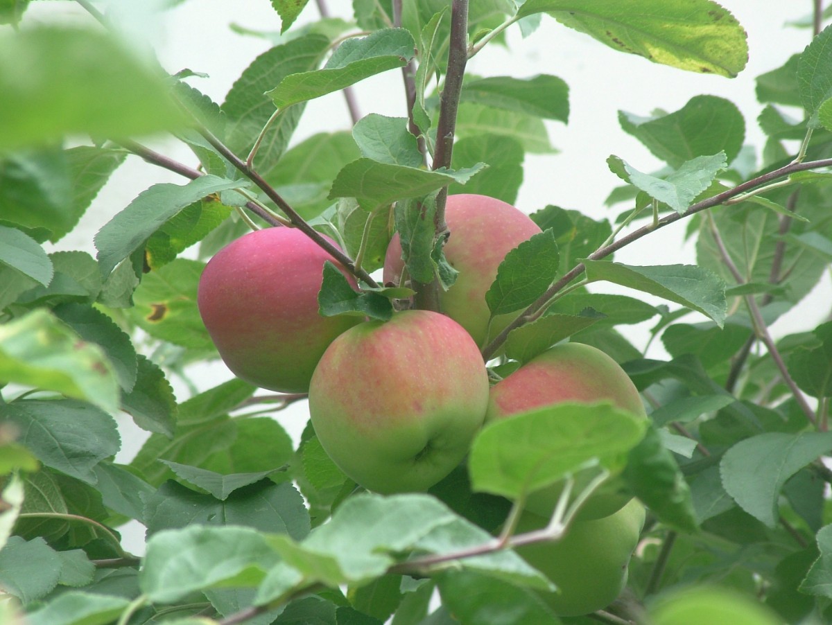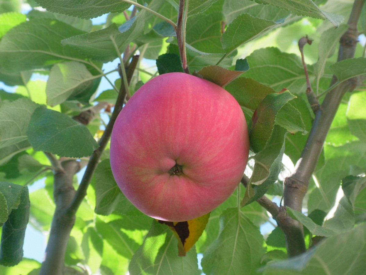 Letní jabloň dává úrodu každý druhý rok, letos byla na jaře celá růžovo bílá, pak zelená, teď jí jablka zčervenala, dozrála, musí se otrhat.