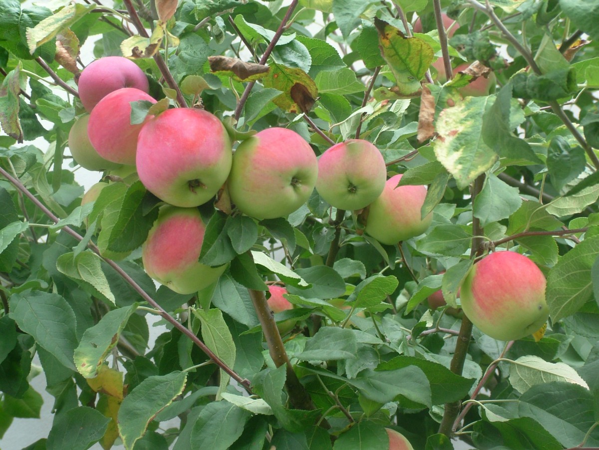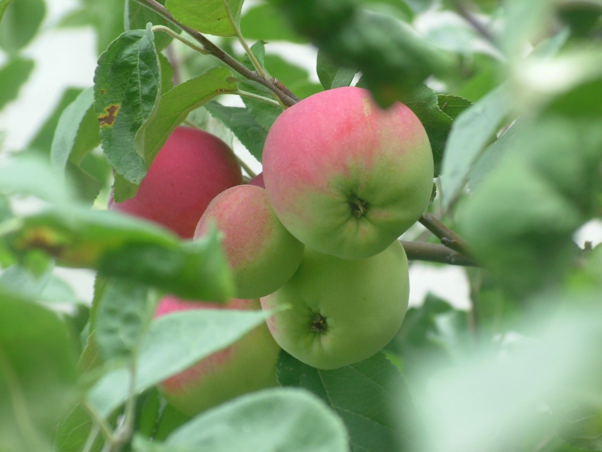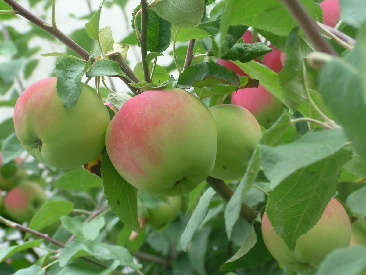 Letní jabloň dává úrodu každý druhý rok, letos byla na jaře celá růžovo bílá, pak zelená, teď jí jablka zčervenala, dozrála, musí se otrhat.