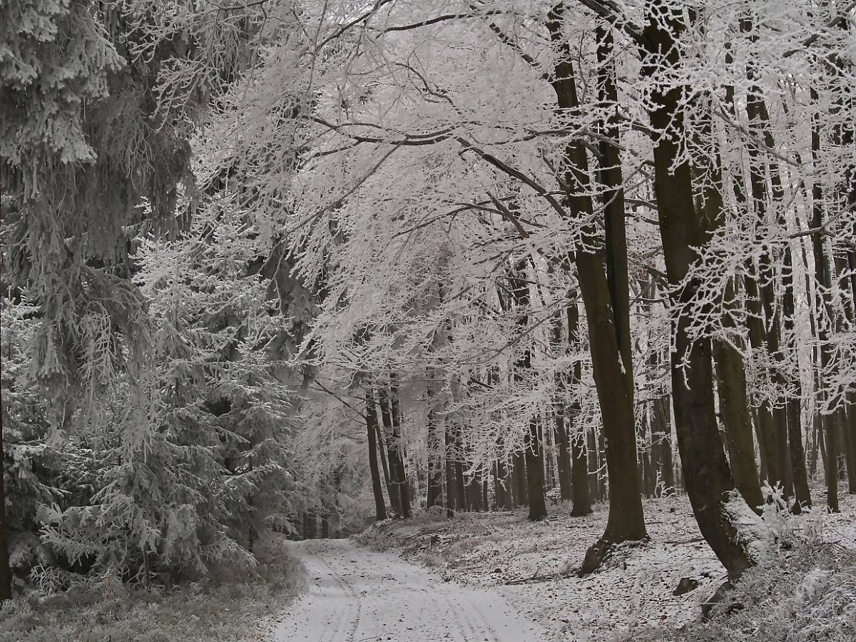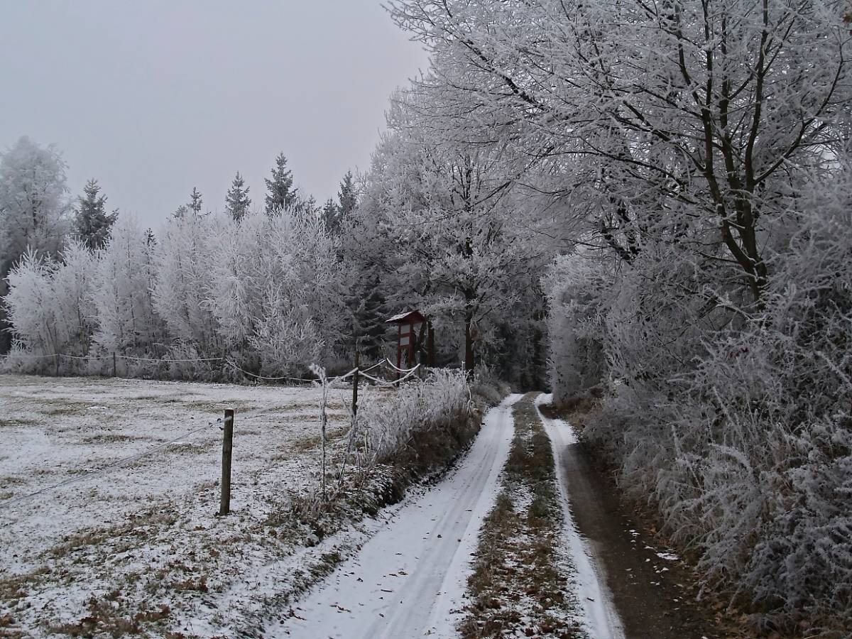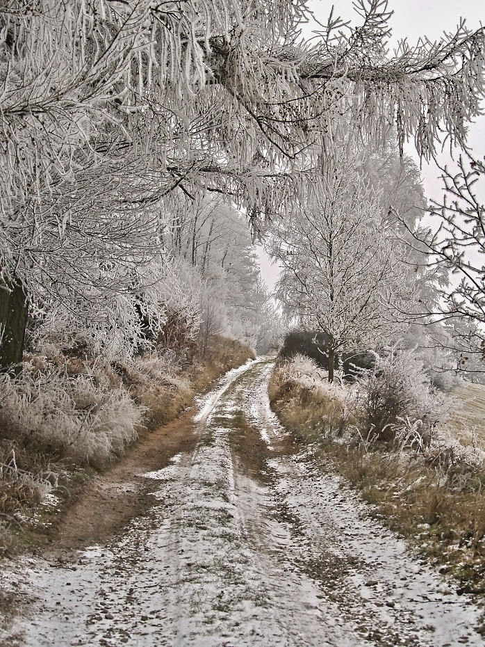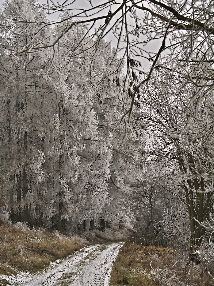 Vlevo vysoké modříny s ještě neopadanými zlatými, nyní stříbrnými jehličkami.