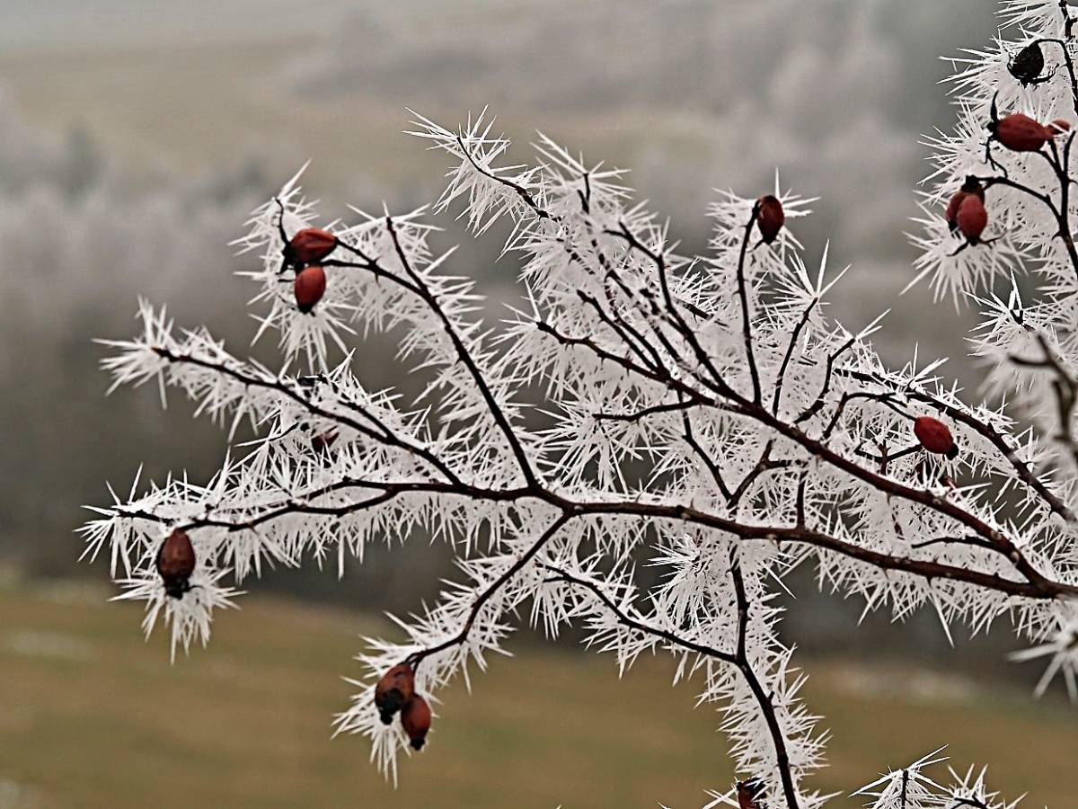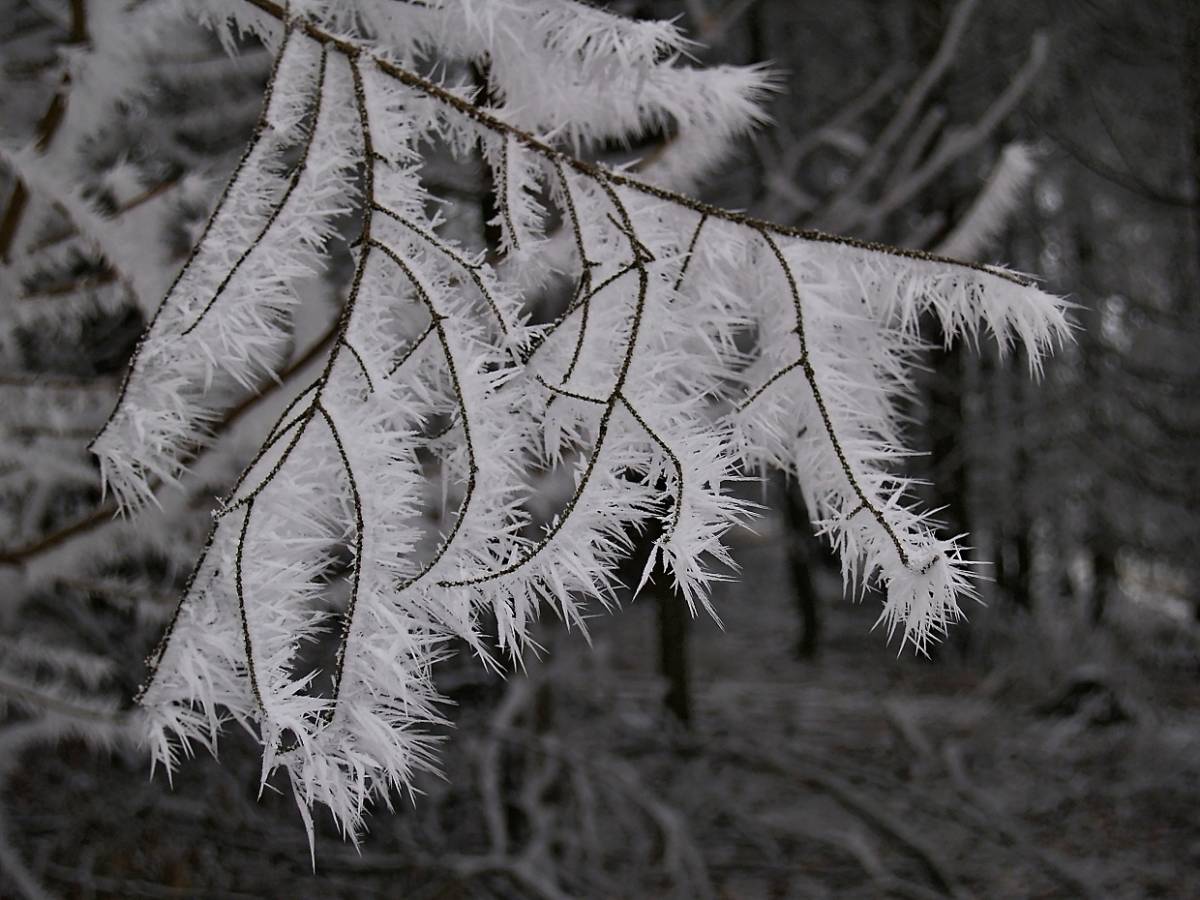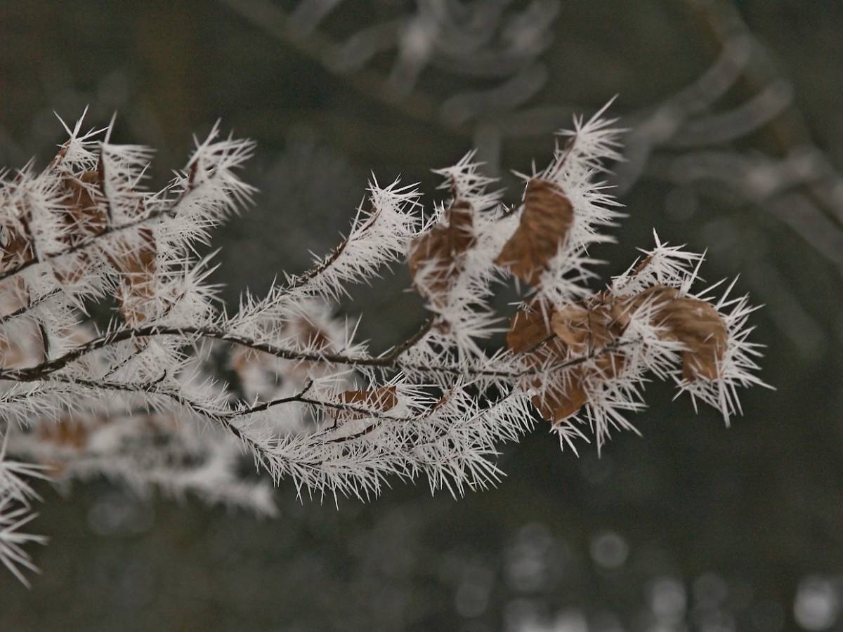 Vlevo vysoké modříny s ještě neopadanými zlatými, nyní stříbrnými jehličkami.