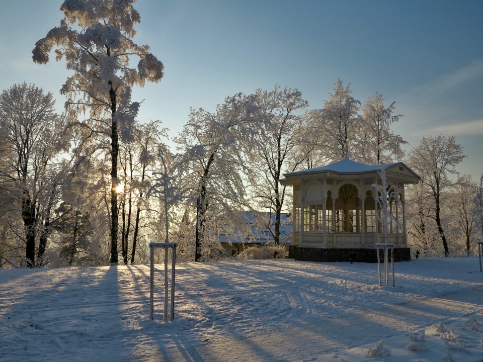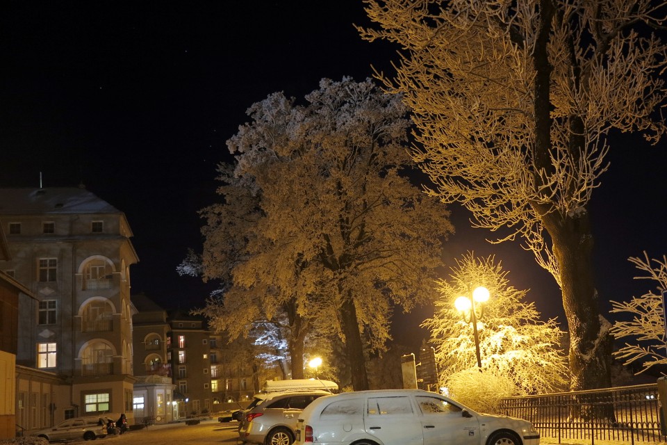 Jeseník - Lázně, zimní večer před Priessnitzovým sanatoriem