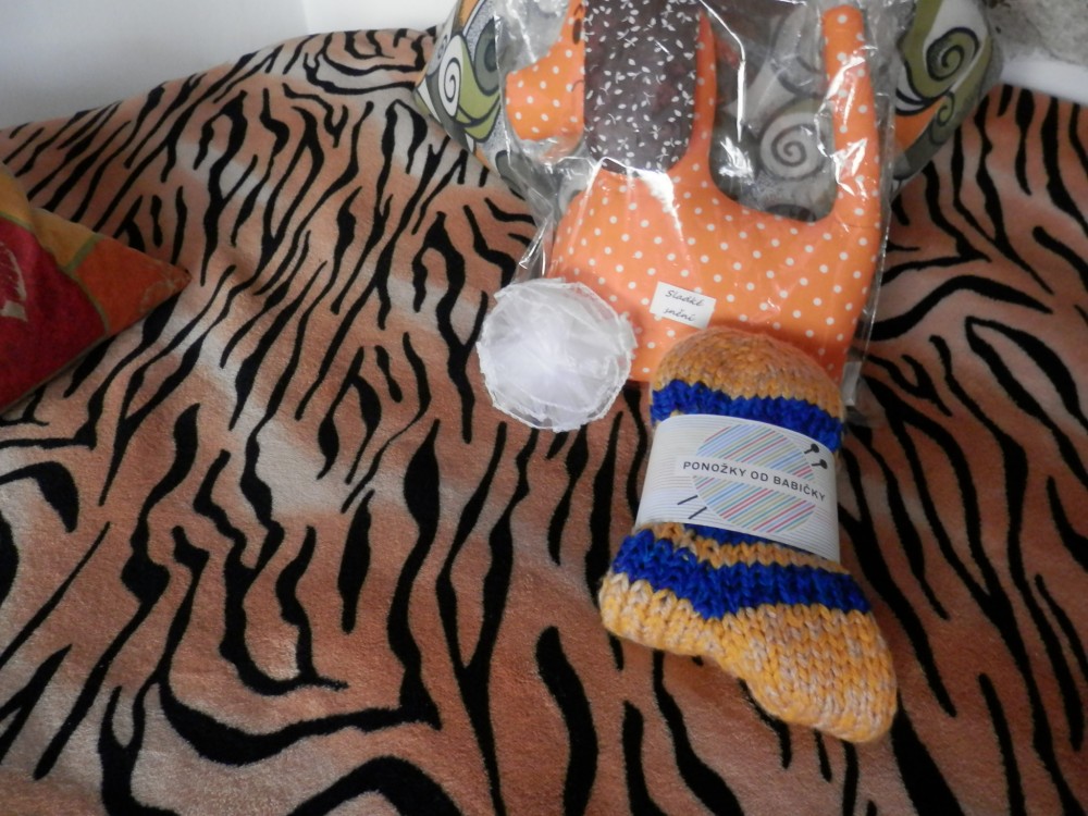 Zakoupené dárky - polštářek, ozdobná kytka na šaty a ponožky
