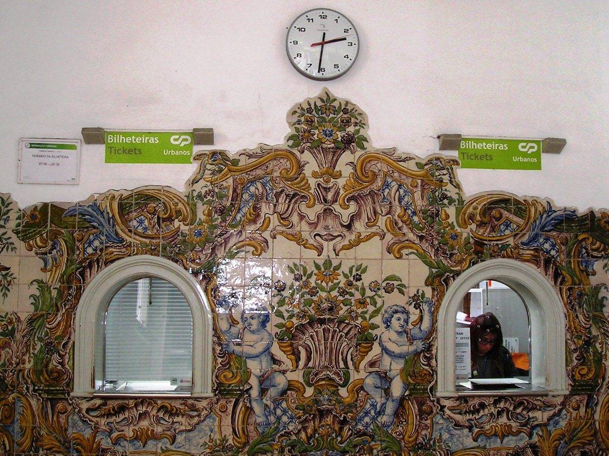 Městečko Sintra. Uvnitř nádražní budovy - čekárna a prodej jízdenek