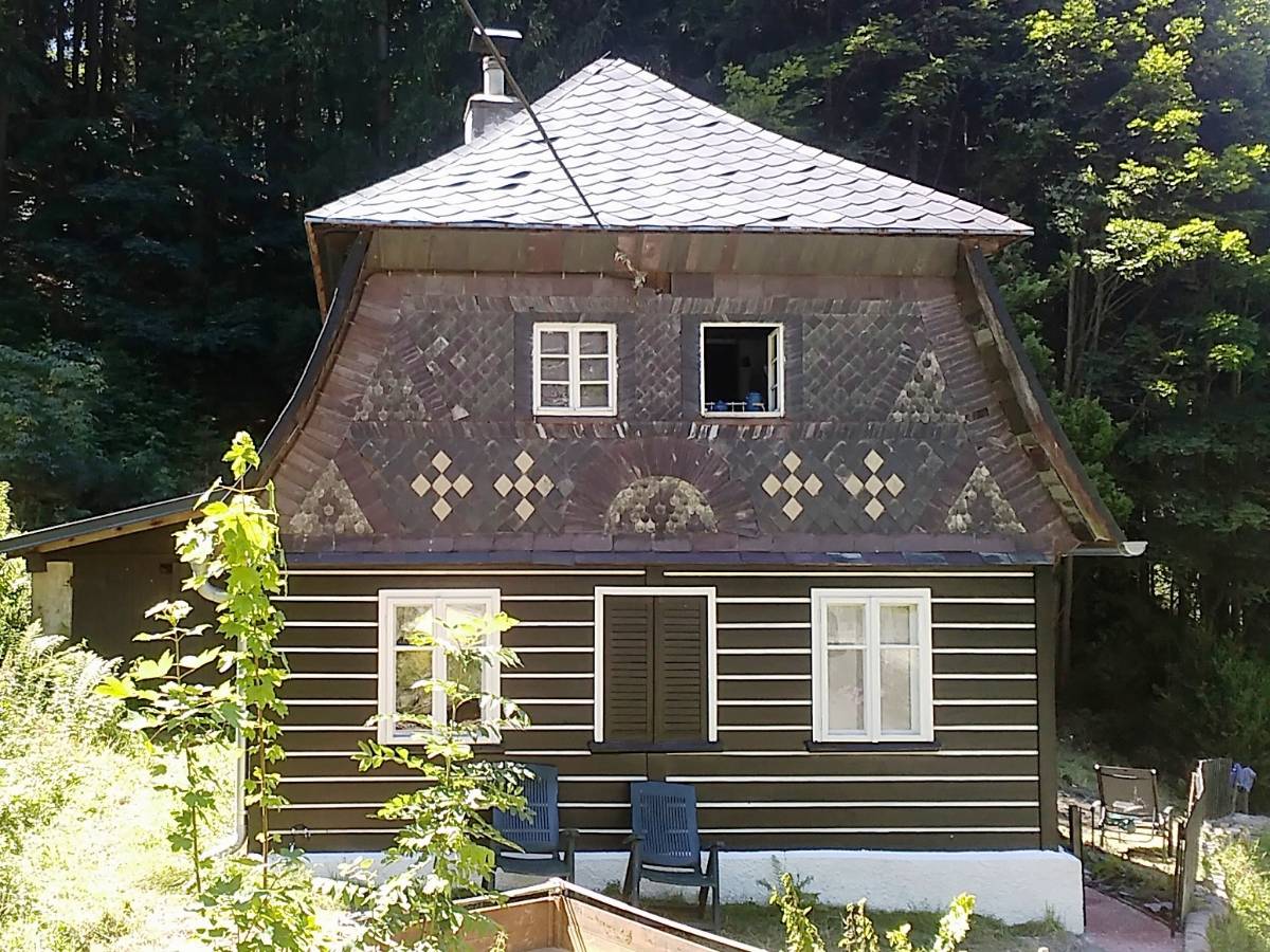 Pěkná roubenka s břidlicovým štítem, nedaleko Malého viaduktu v Novině