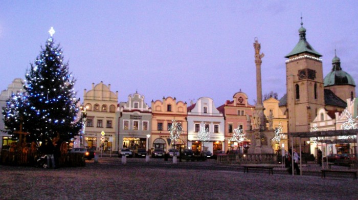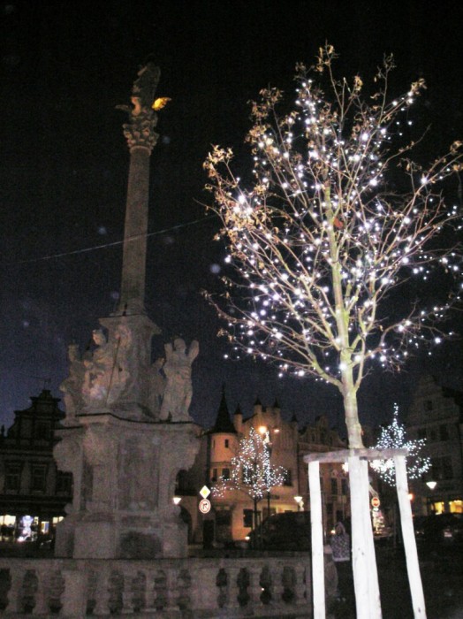 Morový sloup ozařují o vánocích rozsvícené stromky