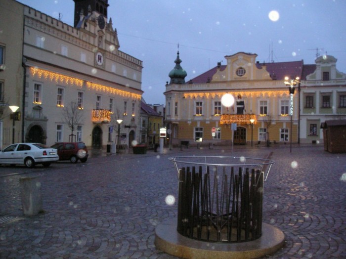 vzadu vlevo Stará radnice (v ní je Knihovna), vpravo MÚ.