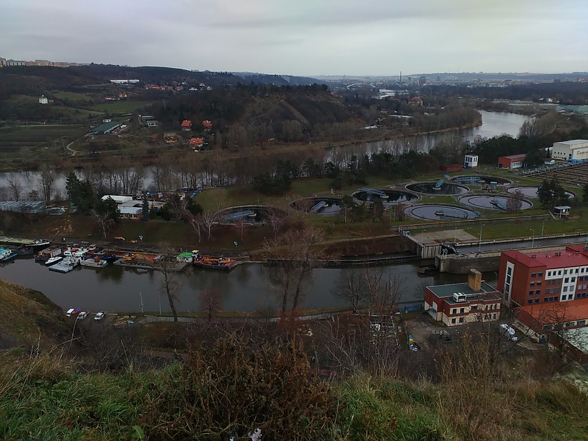 Čistička vody na Císařském ostrově, a za řekou Zoologická zahrada