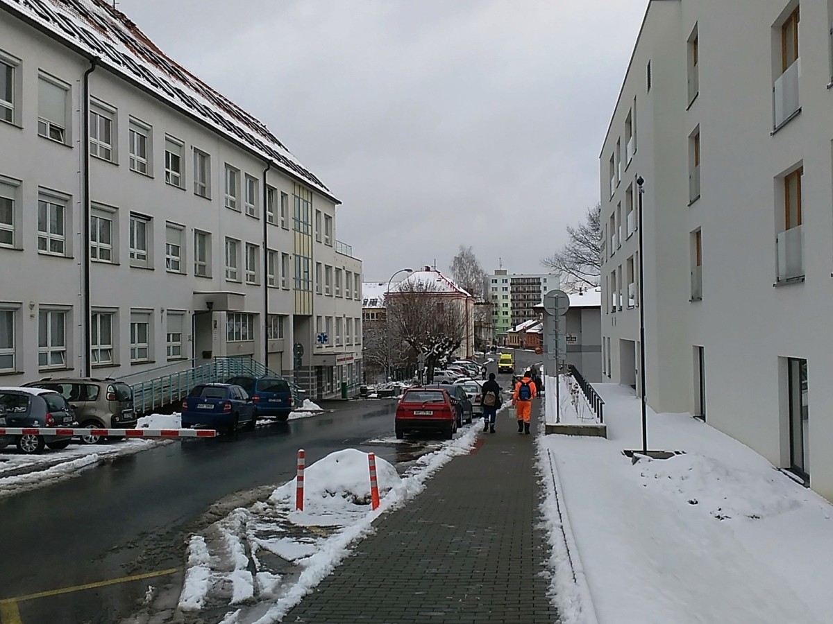 Parkoviště nad Skaut klubem a naproti panelák, z něhož vycházím a vracím se