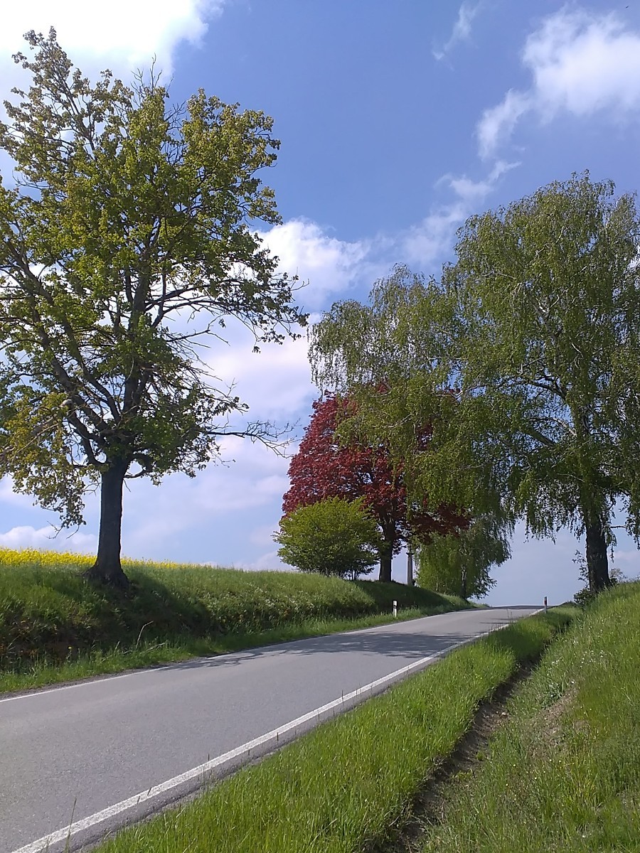 Stromy lemují úzkou silničku, naštěstí se dá jít strouhou.