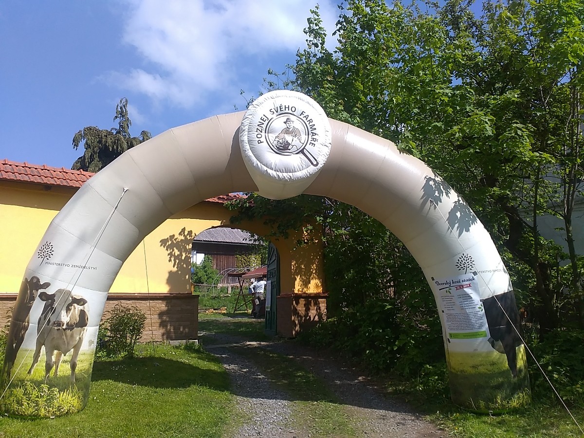 Uvítací brána při akci „Poznej svého farmáře" ve Dvorské kozí farmě.
