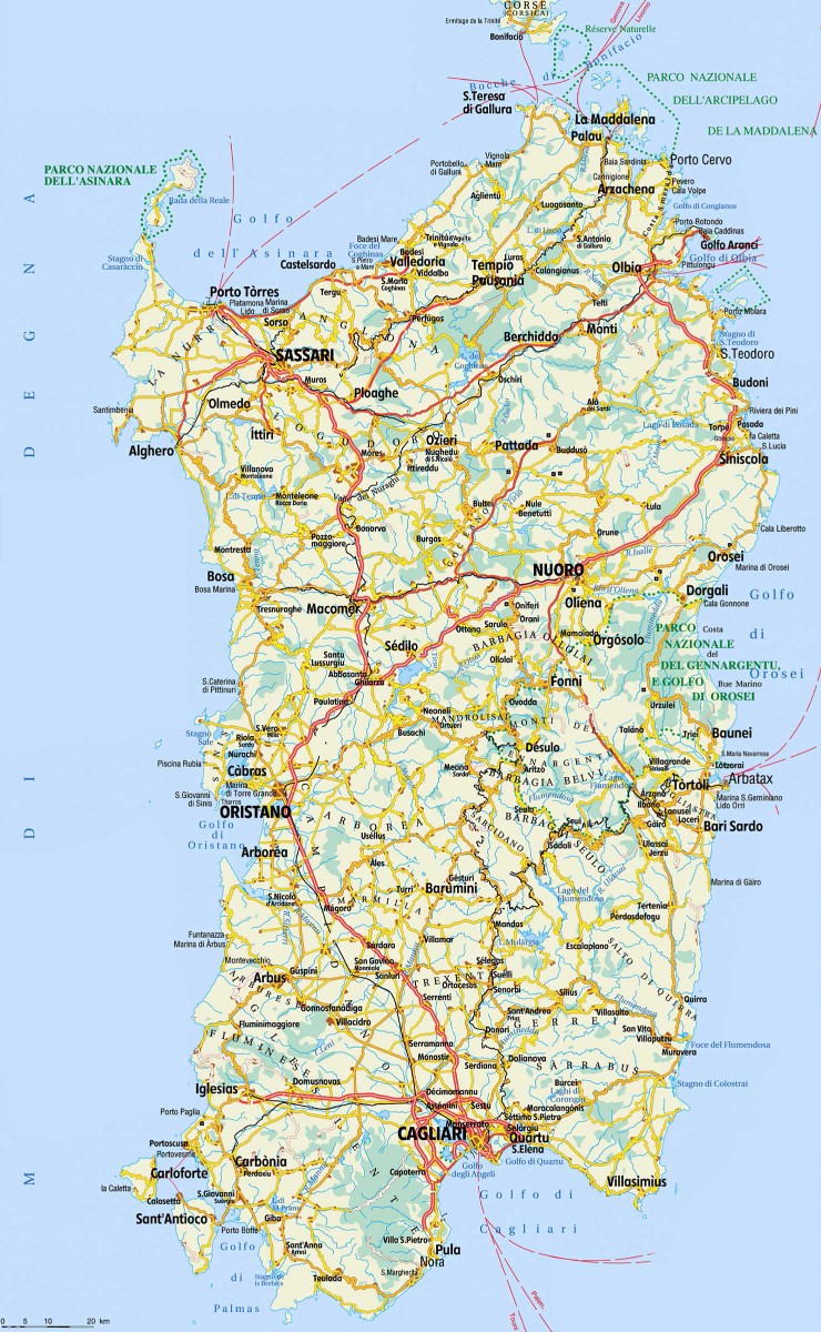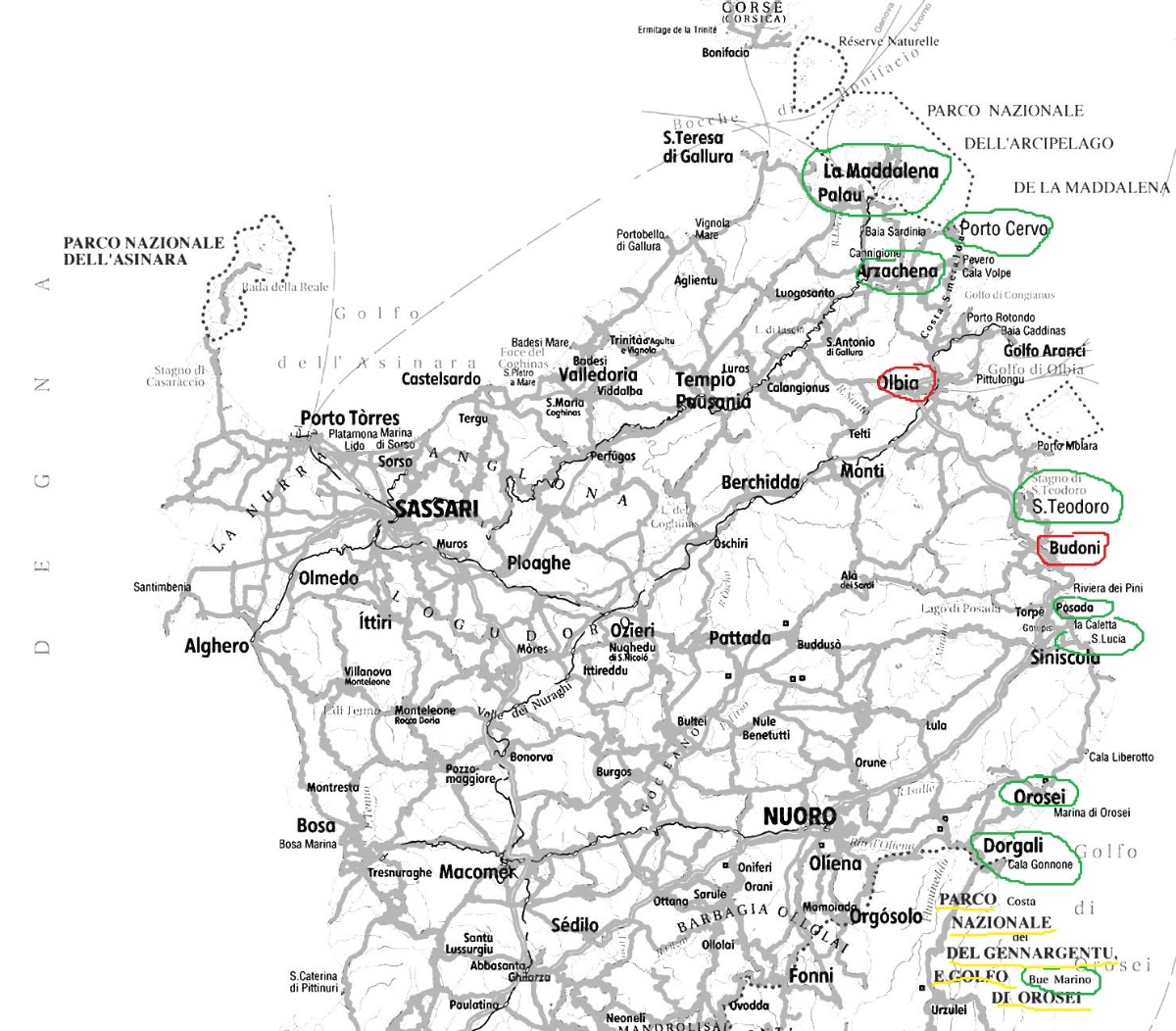 Červeně letiště Olbia a pobytové místo Budoni, zeleně naše výletní místa