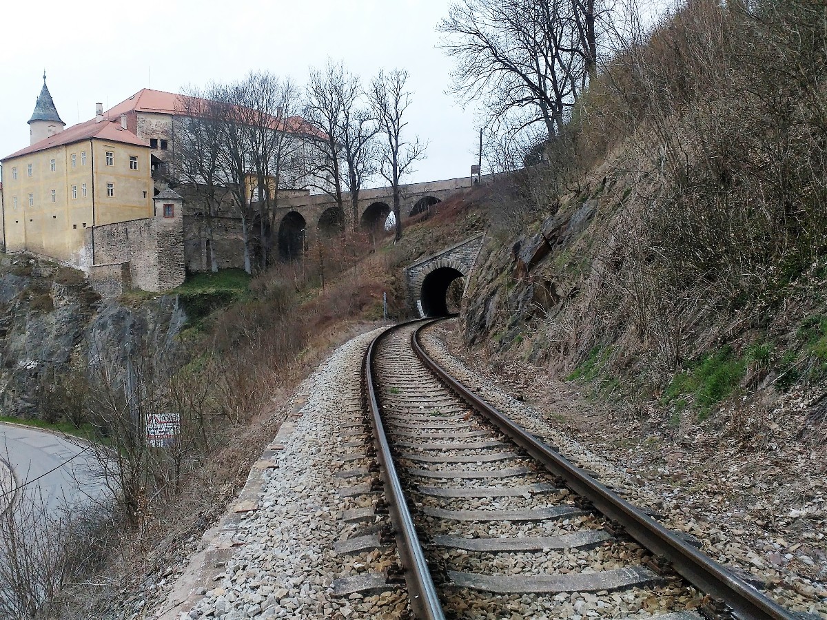 Do skály vedle hradu byl proražen krátký tunel na trati mezi Ledčí a Světlou