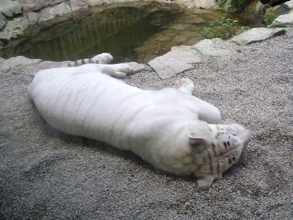 je zvláštní formou tygra indického. Bílé zbarvení je způsobeno částečným nedostatkem barviva. Teď právě odpočívá, protože asi spořádal pěknou porci masa. Foto: J.Handlová, Liberec