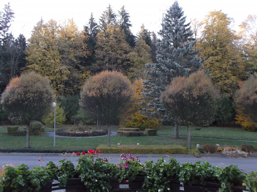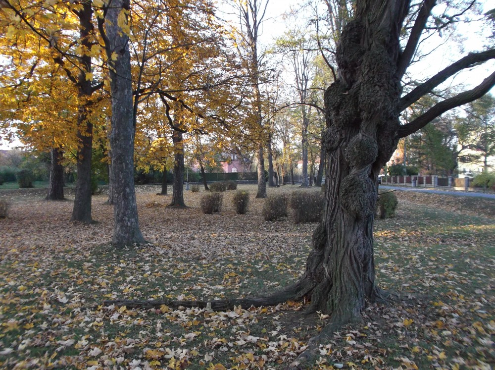 Parčík je lemován stromy s kulatými korunami a přechází v les