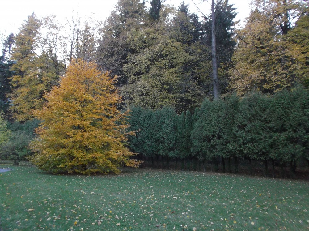Od lesa je parčík oddělen hradbou temně zelených tújí