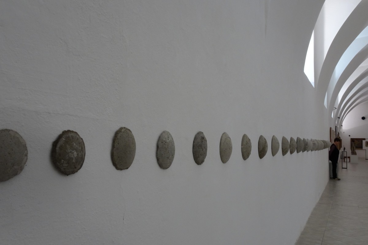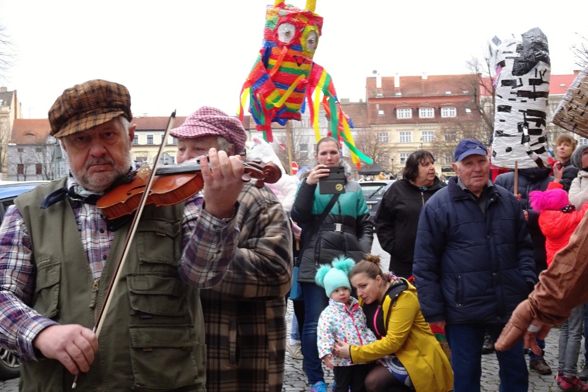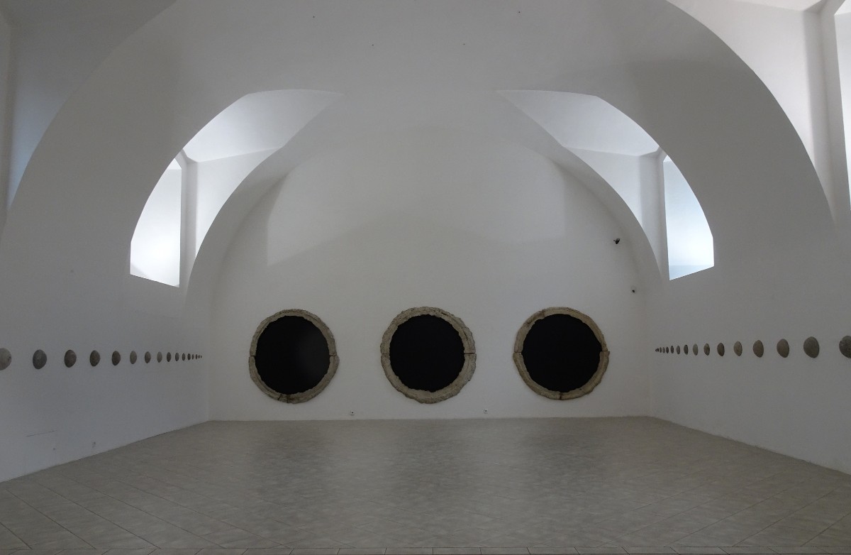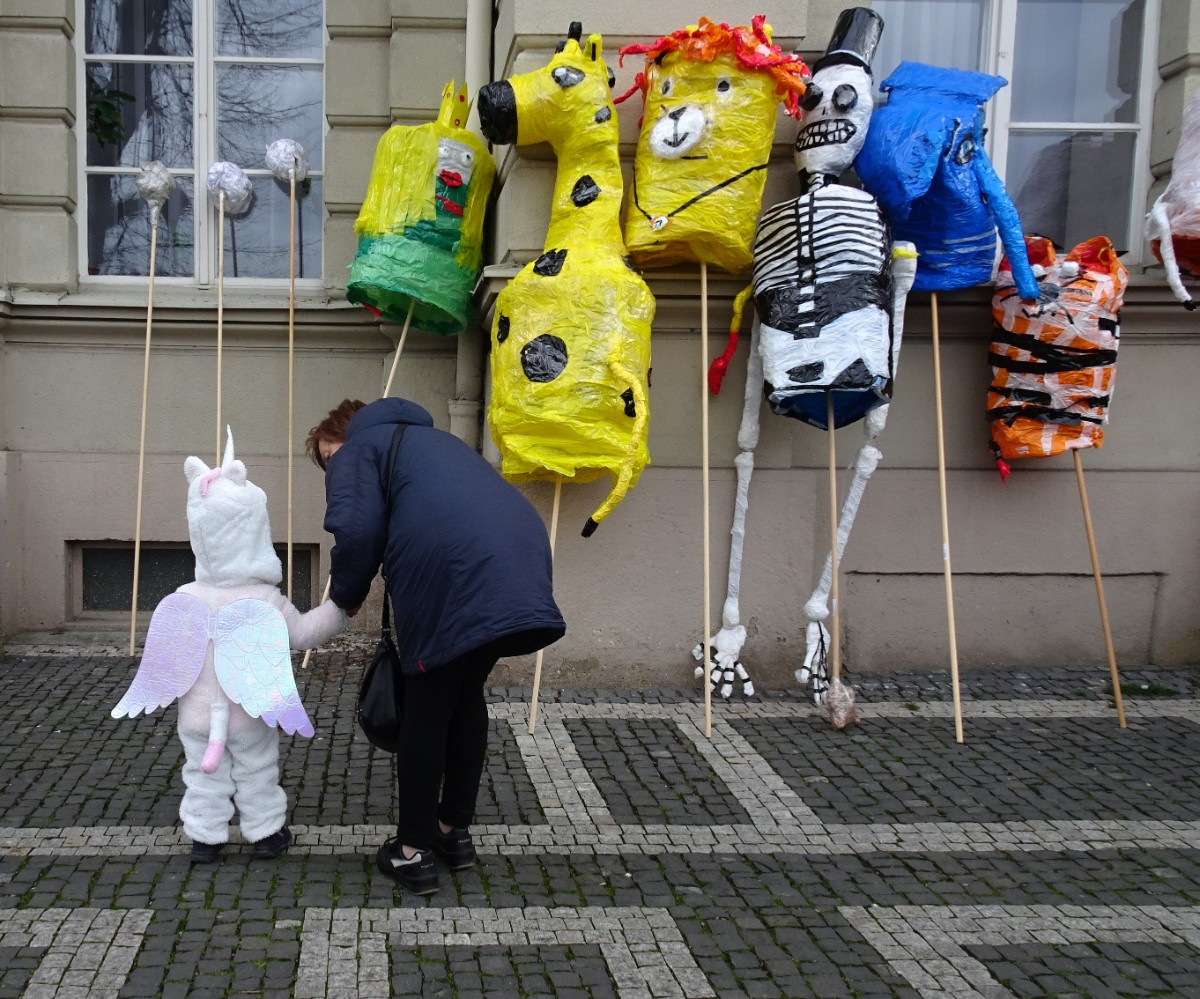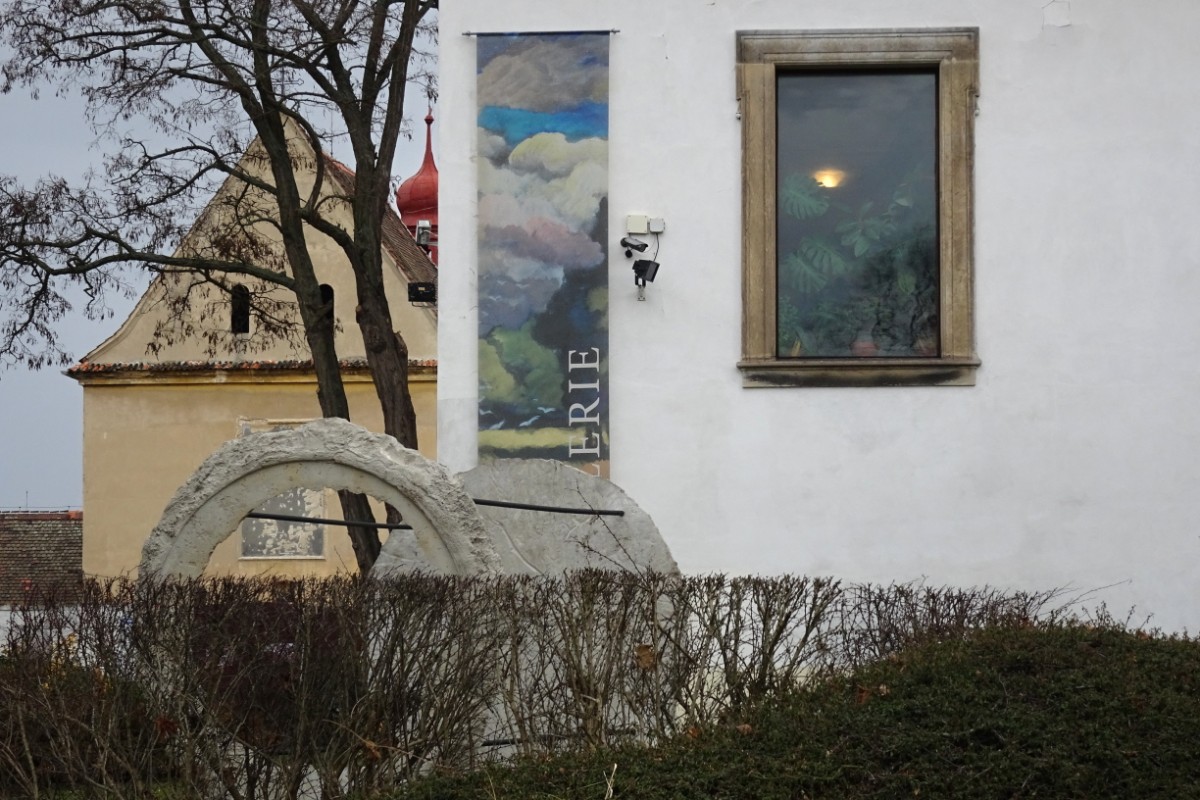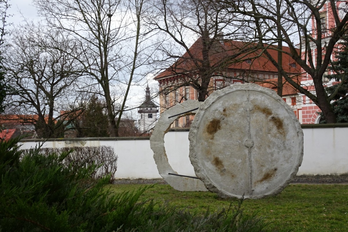Výstava děl autora Tomáše Polcara v Galerii moderního umění v Roudnici n. L., Tvar je prázdnota, prázdnota je tvar. Jedno z děl je umístěno před galerií.Plus roudnický masopust