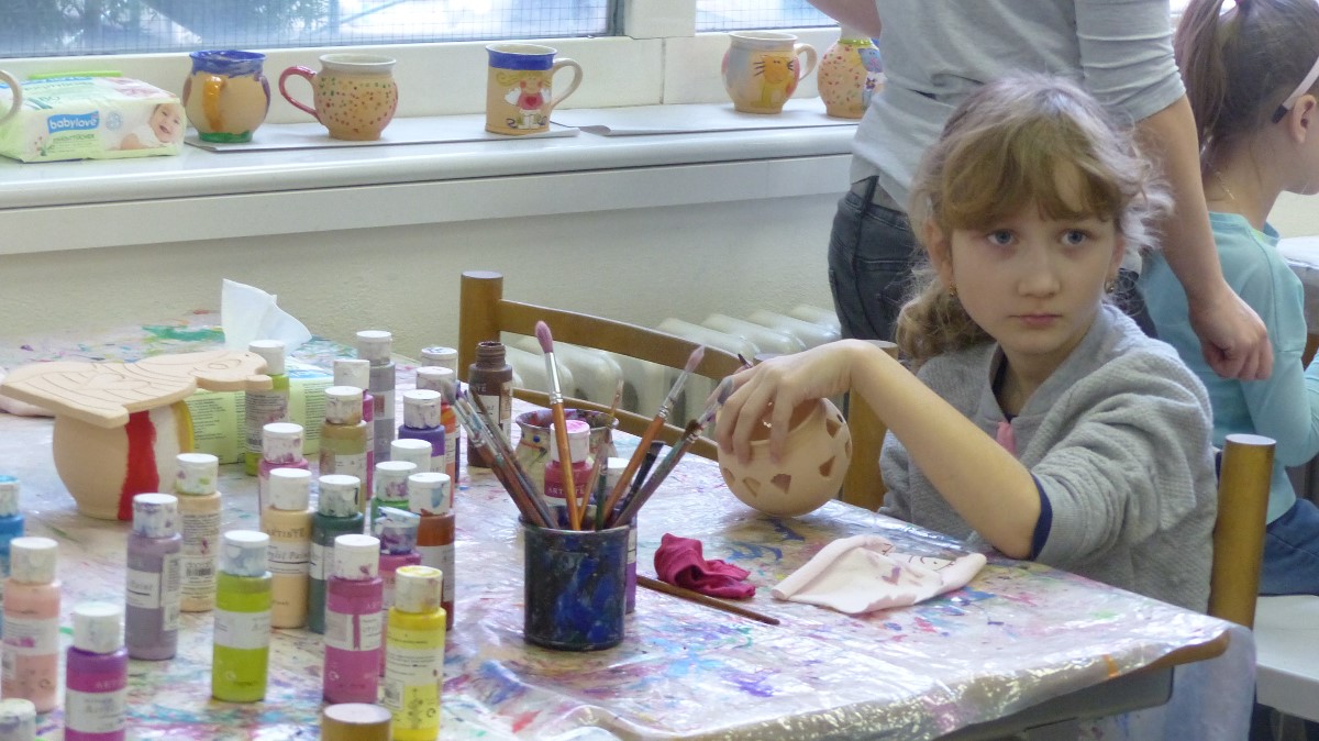 Dívenka zkouší namalovat keramický výrobek